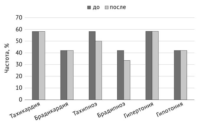 При оценке функциональных показателей сердечно-сосудистой и дыхательной систем (артериальное давление, частота сердечных сокращений и дыхания) у испытуемых обеих групп были выявлены показатели, превышающие возрастные нормы. Анализ исходного вегетативного статуса детей обеих групп показал наличие артериальной гипертензии в 67 и 58% случаев соответственно, выраженные признаки тахикардии — у 67% детей основной и 58% детей контрольной групп. Тахипноэ зарегистрировано в 58% случаев у пациентов как основной, так и контрольной группы. Все выявленные показатели указывают на тонус симпатической нервной системы, напряжение процессов адаптации, хотя для детей младенческого возраста более характерно состояние относительной ваготонии.