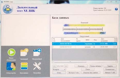 При наличии малейших жалоб со стороны желудка и других органов пищеварения 59 пациентам проводили чувствительный «дыхательный тест» на основе Гелик-Скана®, встроенного на панели РК. Выполняли два «дыхательных теста» на голодный желудок по 6 мин: до приёма карбамида (базальный тест) и после (с нагрузкой карбамидом) на экране синяя полоска в сравнении с базальным тестом заметно увеличивалась пропорционально процентному содержанию аммиака в выдыхаемом воздухе (рис. 5). По результатам изменения цвета в «дыхательных трубках» у 29 (49,15±1,9%) пациентов обнаружен хеликобактериоз выше 10 ед. с нагрузкой и фиксацией на 1 сенсорном экране.