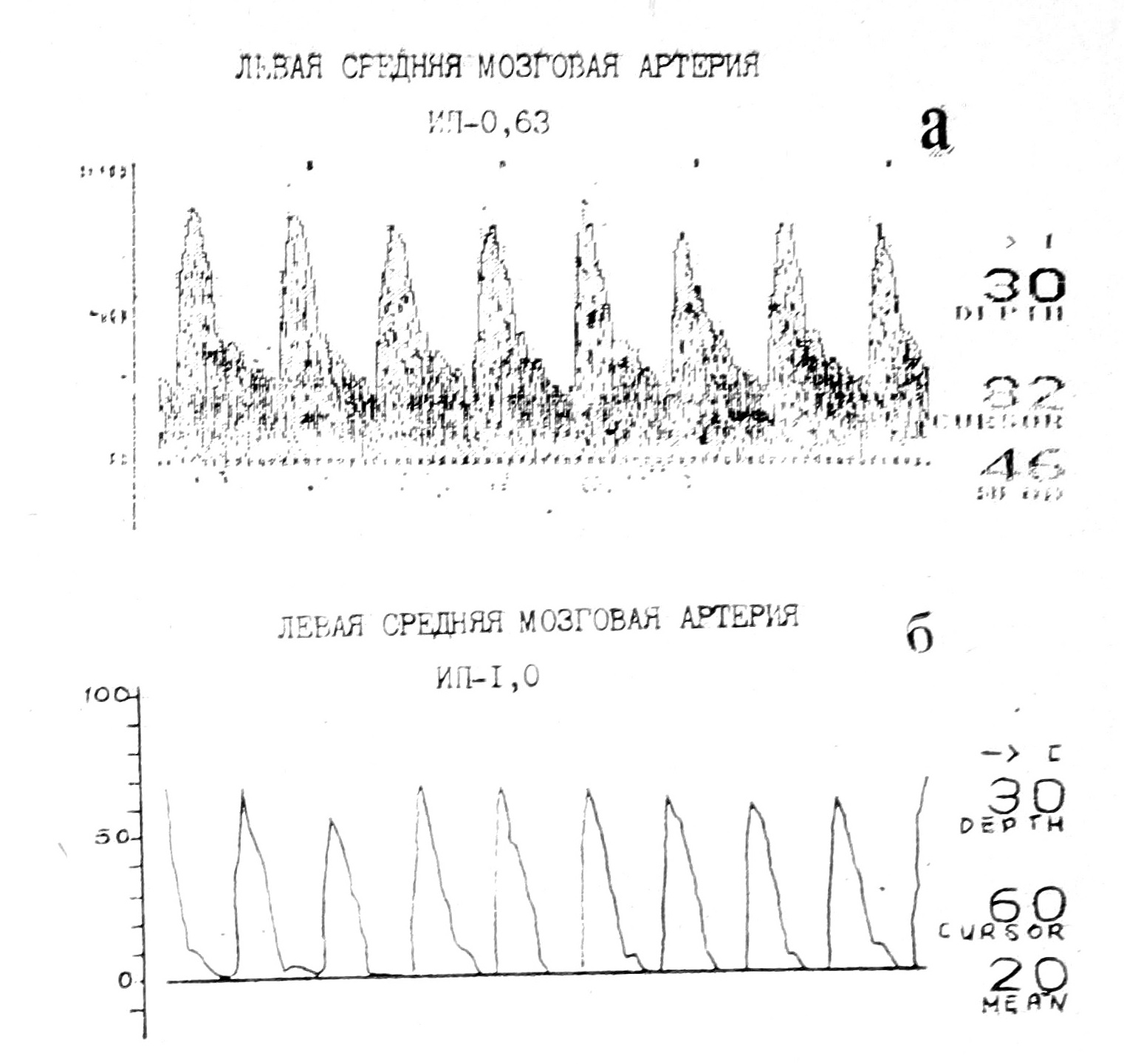 Рис. 3. Изменения мозгового кровотока при герпетическом энцефалите: а — допплерограмма здорового новорожденного, б — отсутствие диастолической скорости кровотока в магистральной артерии головного мозга у новорожденного с герпетическим энцефалитом (по данным транскраниальной допплерографии).