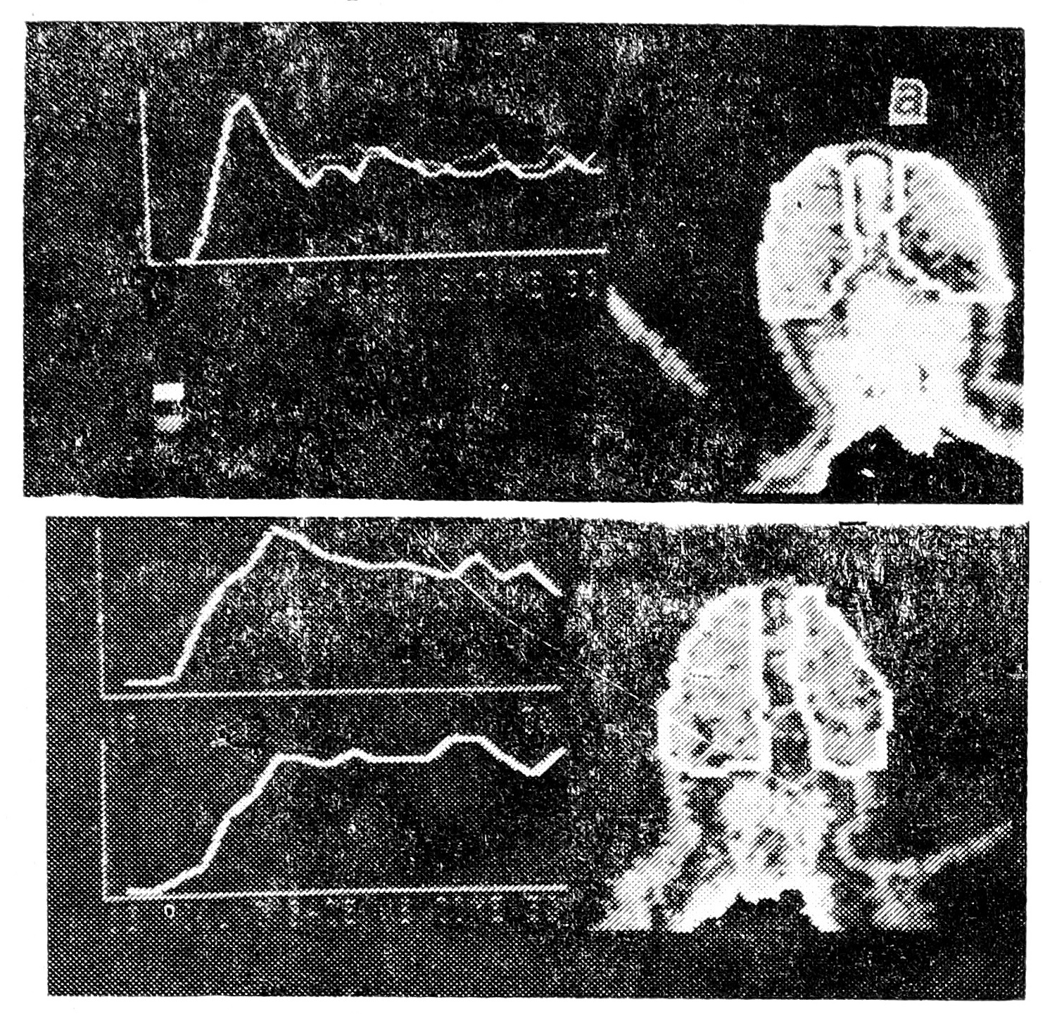Рис. 2. Энцефалосцинтиграмма и кривые «активность — время» при герпетическом энцефалите: а — данные новорожденного ребенка без поражения головного мозга; б — увеличение времени артериальной и венозной фаз у новорожденного с герпетическим энцефалитом (2 недели жизни).