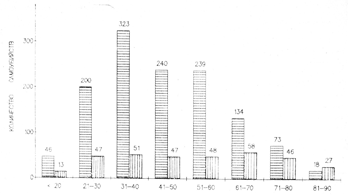 Рис. 1. Частота самоубийств в зависимости от возраста и пола (за 1988—1992 гг.). Обозначения: столбцы с горизонтальными линиями — число мужчин, с вертикальными — число женщин. Под столбцами — возрастные интервалы.