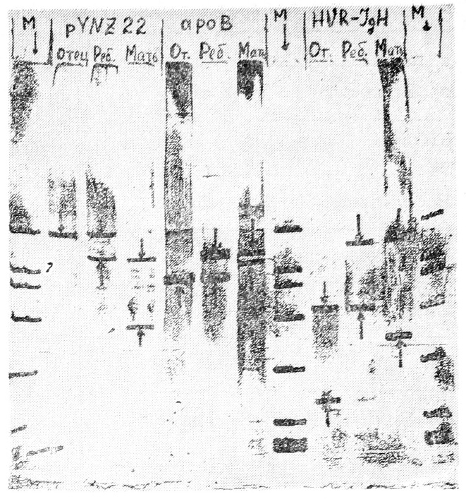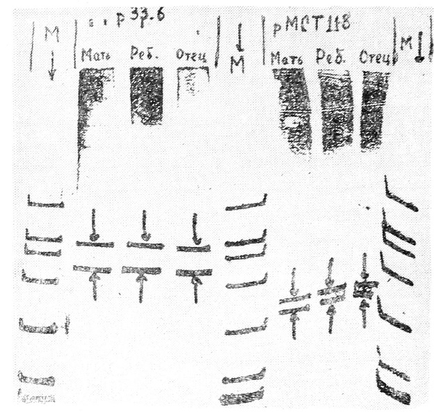Как следует из представленных данных, нуллифицированные участки генома отца (О) и матери (М) находятся на различных уровнях (pYNZ22, ароВ, HVR-JgH), а две последние наследуются независимо (рМСТ 118 и p33.6). Амплифицированные участки ДНК ребенка (Р) располагаются на уровне полос отца и матери. Это свидетельствует о том, что один участок гена ребенок унаследовал от отца, а другой — от матери. Уже первоначальный анализ расположения полос на электрофореграмме, перекрывание полос ребенка полосами отца и матери свидетельствует об их родстве.