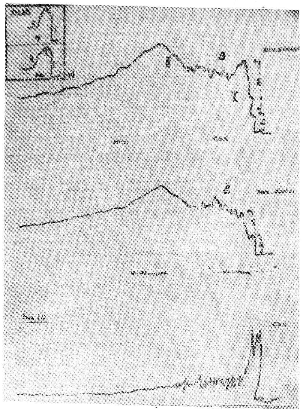 Ренограмма состоит из трех кривых, две из которых характеризуют деятельность каждой почки и третья — процесс очищения крови от введения препарата (рис. 1А). Каждая почечная кривая имеет три отрезка: начальный (или васкулярный), характеризующий состояние васкуляризации каждой почки (норма 15—30 сек.); второй (канальцевый), характеризующий функцию канальцевого эпителия (норма 3—4 мин.); третий (эвакуаторный), отображающий выделительную функцию почек и верхних мочевыводящих путей (норма 12—15 мин.). По изменению конфигурации и временных показателей кривых можно судить о нарушении в деятельности каждой почки и ее различных отделов — васкуляризации, канальцевой секреции и эвакуаторной способности. Предлагаемая методика позволяет детально оценить секреторную и эвакуаторную функции почек. Что касается васкуляризации, то о ней можно судить лишь косвенно, по сравнительной величине первичного подъема кривых. Для более точной оценки васкуляризации каждой почки мы воспользовались методикой, предложенной проф. В. Г. Спесивцевой и соавт. (1967), суть которой заключается в регистрации васкулярного отрезка ренограммы шлейфовым осциллографом с последующим проявлением фотобумажной ленты. В отличие от указанной методики в наших исследованиях регистрация расшифрованного васкулярного, канальцевого и эвакуаторного отрезков ренограммы производилась на одной диаграммной ленте в виде непрерывной чернильной кривой. В момент введения изотопа скорость движения ленты равна 1 мм/сек., через 30—35 сек. самописец переключали на меньшую скорость — 180—200 мм/час и продолжали регистрацию канальцевой секреции и эвакуации. Указанный метод получил название реноангиографии (кривая — реноангиограмма).