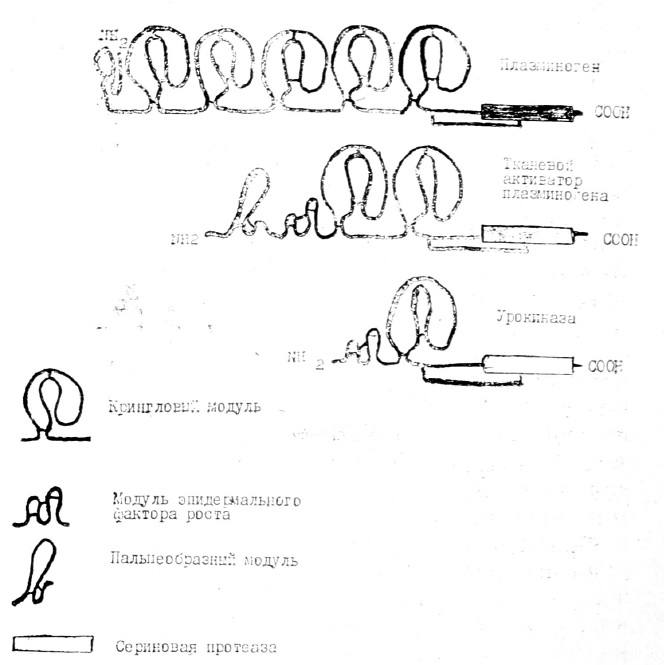 Урокиназа (КФ. 3.4.99. 26) синтезируется главным образом в почках в виде одноцепочечного гликопротеина с молекулярной массой около 54 кДа. Продолжается дискуссия о том, может ли одноцепочечная форма рассматриваться как истинный профермент (проурокиназа) или она обладает собственной каталитической активностью. Урокиназа, подобно тканевому активатору плазминогена, состоит из нескольких модулей. С N-конца молекула начинается с модуля фактора роста, затем следует один крингл и заканчивается C-концевой сериновой протеазой (рис. 1). Расщепление одной пептидной связи Лиз 158— Илей 159 между кринглом и модулем; сериновой протеазы под действием плазмина или калликреина приводит к образованию классической двуцепочечной структуры, которая обладает возросшей на 2 порядка активностью по отношению к низкомолекулярным субстратам и к плазминогену. В противоположность тканевому активатору плазминогена урокиназа не проявляет особого сродства к фибрину.