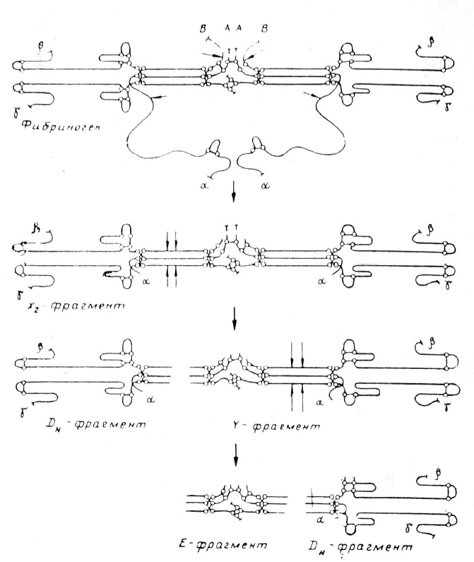 Рис. 2. Схема протеолиза фибриногена плазмином (Л.В. Медведь, С.В. Литвинович). Стрелками отмечены места преимущественного расщепления: светлыми кружочками — дисульфидные связи, альфа, бета, гамма — COOH-концевые участки полипептидных цепей; A, B — NH2-концевые фибрин-пептиды.