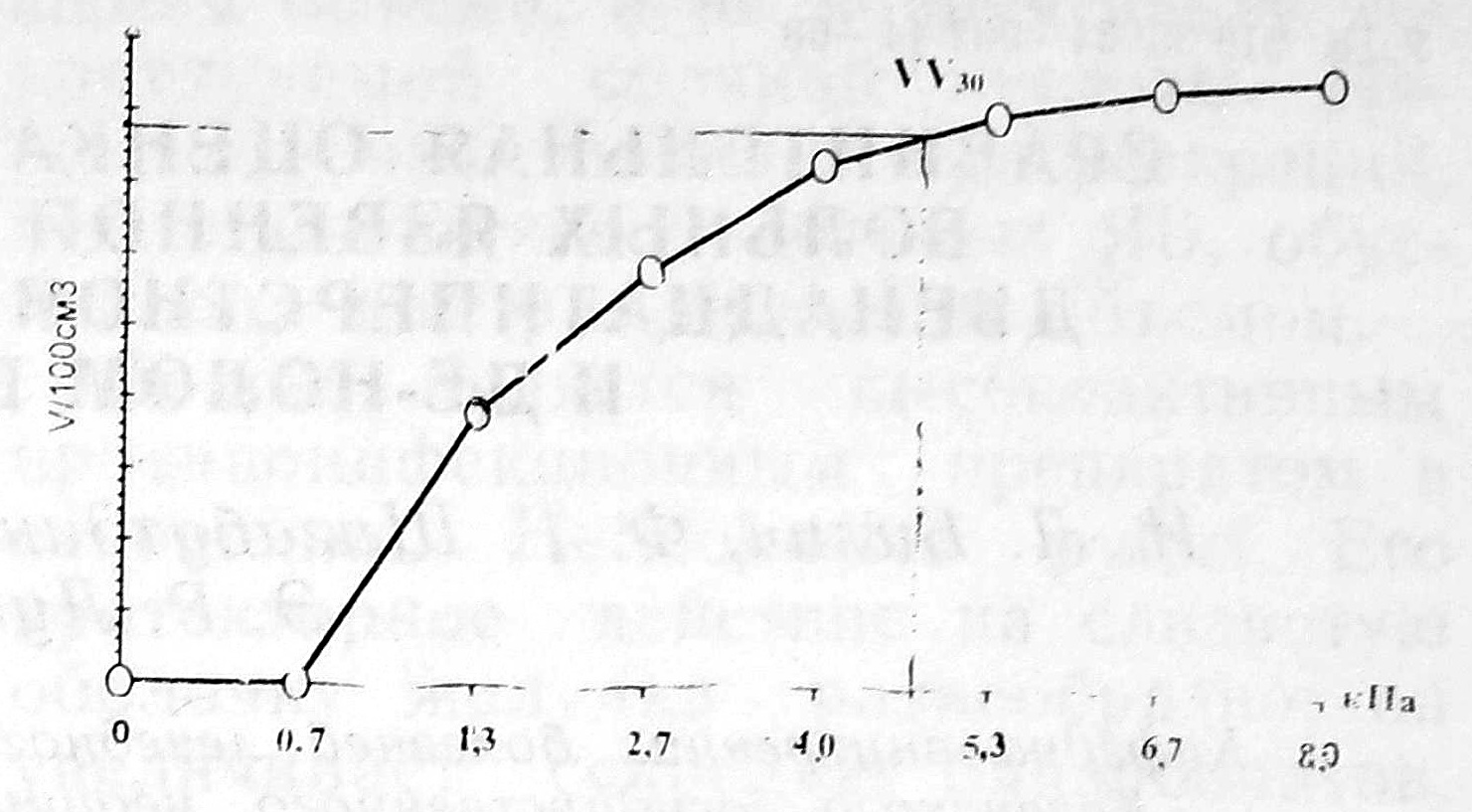 Сигналы регистрировали на самописце «Мингограф-34» (фирма «Siemens»). Исследования проводили в положении больного лежа на спине с отведенной в сторону и приподнятой рукой, чтобы предплечье располагалось на 10 см выше уровня грудной кстенки. Для осуществления окклюзии на средней трети плеча фиксировали пневматическую манжету шириной 12 см; реографические электроды из мягкой металлизированной ленты шириной в 5 мм в виде круговых манжет располагали на предплечье. Шприцем емкостью в 100 мл медленно и плавно нагнетали воздух в манжету, определяли минимальное давление, вызывавшее регистрируемое увеличение объема предплечья. Затем измеряли объем предплечья при давлении в манжете, равном 1,3; 2,7; 4,0; 5,3 6,7 кПа. Для каждого исследования строили кривую зависимости изменения объема от давления в манжете (см. рис.).