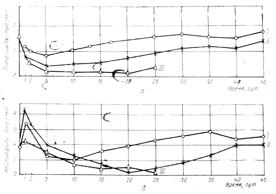 Рис. 1. Динамика изменений количества лимфоцитов (а) и нейтрофилов (б) в периферической крови в зависимости от степени тяжести ОЛБ.