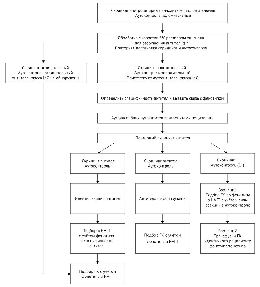 Рис. 1. Алгоритм определения антиэритроцитарных аллоантител при положительном результате скрининга и положительном аутоконтроле; Ig — иммуноглобулин; НАГТ — непрямой антиглобулиновый тест; ГК — гемокомпоненты