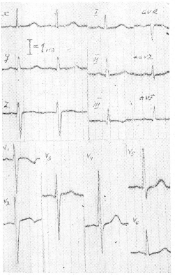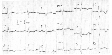 Почему КОО в диагностике ГЛЖ оказались более информативными, чем 12 обычных отведений, а в диагностике ГПЖ менее информативными? Мы считаем возможным дать следующее объяснение: в 12 традиционных отведениях для диагностики гипертрофии правого желудочка большое значение имеет отведение V1, которое часто не находит отражения в КОО. Весьма важные для диагностики гипертрофии левого желудочка отведения V5 и V6, как правило, находят отражение в КОО (в отведении X или У). Кроме того, большую дополнительную информацию несет отведение Z, улавливающее потенциалы левого желудочка в сагиттальной плоскости, особенно при поворотах сердца верхушкой кзади. На рис. 1 представлена ЭКГ Наташи Б., 9 лет. Диагноз: вторичный дефект межпредсердной перегородки, подтвержденный на операции. В КОО зарегистрированы следующие признаки ГПЖ: , , ВВО = 0,04 с, , , , , , в 12 обычных отведениях - 6 основных признаков ГПЖ.