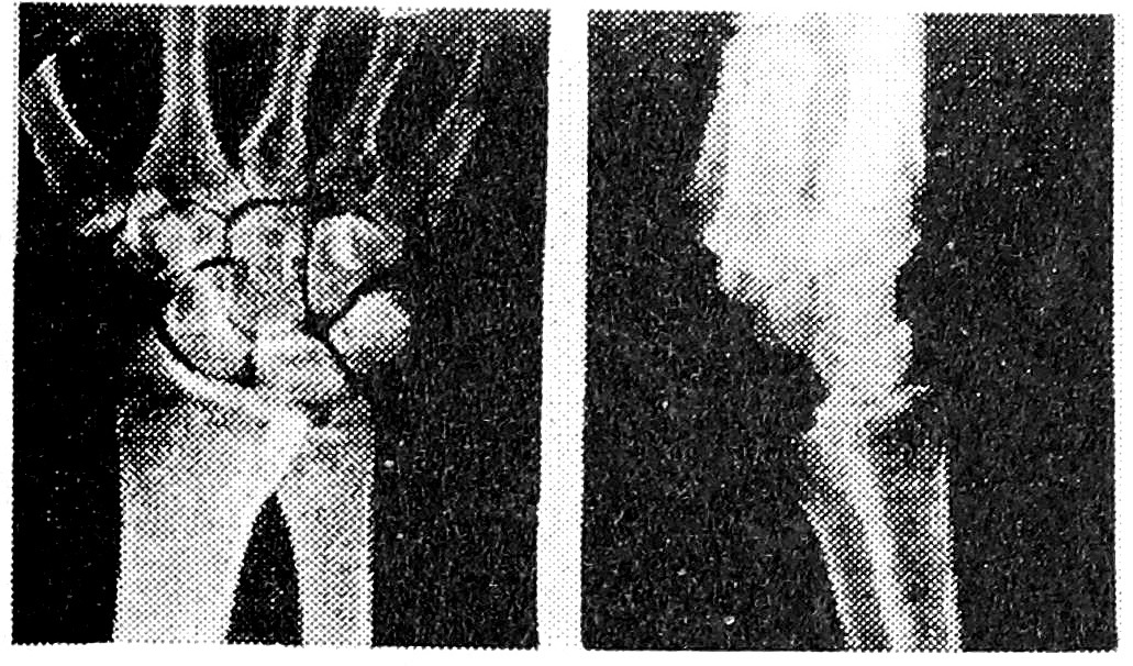 А., 47 лет, поступил в отделение кисти НИЦТ “ВТО” 01.03.1995 г. с диагнозом: застарелый ладонный вывих головки правой локтевой кости в дистальном лучелоктевом суставе давностью 2,5 месяца (рис. 1).