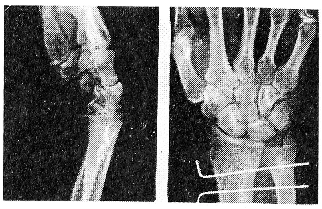 По данным литературы [1], открытое вправление застарелых вывихов головки локтевой кости давностью свыше 1,5—2 месяцев не имеет смысла, так как оно становится трудным, травматичным и ведет к неблагоприятным функциональным исходам. Мы не можем согласиться с этим утверждением, ибо даже на сроках более 2,5 месяца после переднего вывиха головки локтевой кости в дистальном лучелоктевом сочленении удается атравматично открытым способом вправить вывих и получить хорошие функциональные результаты. Свидетельством тому является наш небольшой опыт (2 случая) открытого атравматичного вправления с хорошими результатами.