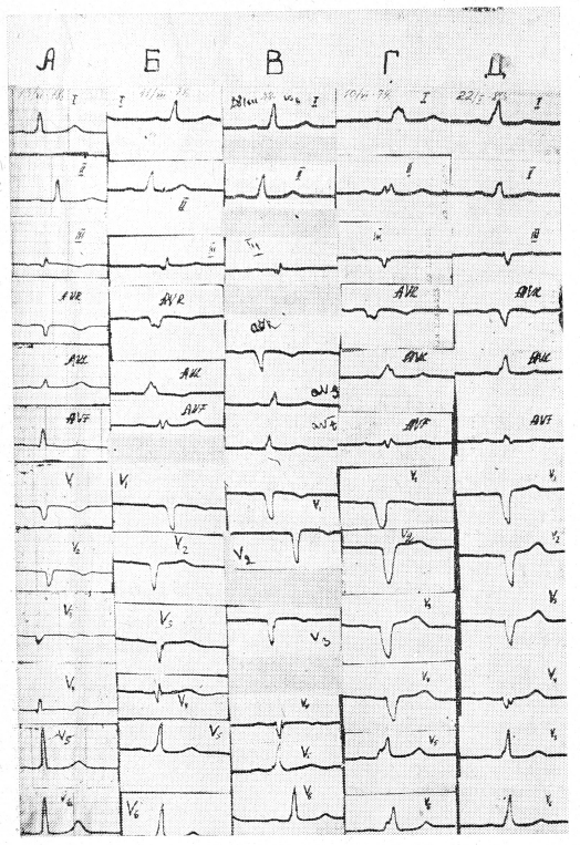 Проведено лечение интенкордином, оротатом калия, кокарбоксилазои. Назначены настой валерианы, седативные средства, витамины. Отмечена непереносимость хинидина, аймалина, новокаинамида. Приводим пять электрокардиограмм (см. рис.).