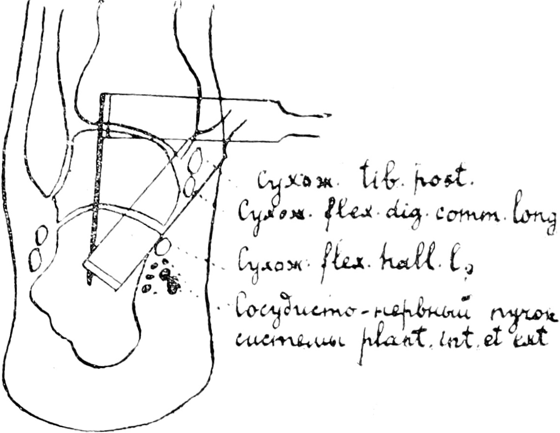 Последовательные этапы нашей операции таковы: сначала производится иссечение призматической костной пластинки (можно без надкостницы) из передне-внутренней поверхности tibiae здоровой или больной ноги, примерно в 1/3 длинника большеберцовой кости и шириною почти во всю ее передне-внутреннюю поверхность; затем проводится разрез кожи, начиная от внутренней лодыжки, вниз и чуть кзади до пяточной кости. В ране обнажаются сухожилия: вверху in. tibialis postici, под ним m. flex. digit. comm. longi; оба они оттягиваются крючками пли перерезываются. Несколько ниже, тотчас под уровнем таранно-пяточного сустава, лежит сухожилие m. flexoris hall, longi, которое перерезывать не следует, так как под ним расположены подошвенные сосуды и нервы (рис. 1). Кровотечение из этих сосудов осложняет производство операции и последующее течение раны. Далее, установив стопу под нужным углом к голени, пробивают долотом, параллельно линии кожного разреза, глубокую щель в медиальной лодыжке и таранной кости. Для того, чтобы пробить calcaneus, не задевая подошвенного сосудисто-нервного пучка, долото необходимо приподнять ручкой кверху и завести его острый конец кнутри от сухожилия m. flexoris liallucis longi (рис. 1); надо избегать раскалывать опорную поверхность calcanei. Когда щель готова, останавливают сухим тампоном кровотечение и вводят внутрь щели трансплантат (рис. 2). Чтобы прочнее вклинить его, кладут по длиннику трансплантата ребром долото и слегка ударяют по последнему молотком. Кожа над раной наглухо зашивается; если же кое-где стянуть швы не удается, то оставляют йодоформный тампон. Для усугубления эффекта фиксации стопы и, главное, для коррекции положения пальцев, к описанной операции присоединяют укорочение и тенодез разгибателей. В заключение накладывается гипсовая повязка не менее, как на 3 месяца у взрослых и на 4 месяца у детей.