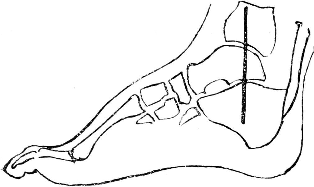 Работая над указанной задачей, мы позволяем себе в настоящее время предложить вниманию товарищей новую оперативную модификацию, суть которой заключается в том, что иссечение хряща заменяется глубоким вертикальным рассечением внутренней лодыжки, tali и calcanei, а фиксация достигается аутопластической костной пластинкой, вгоняемой в раневую щель с медиальной стороны корня стопы. В общем наша операция больше всего напоминает способ Leхеr’а. Мы также фиксируем над—и подтаранный сустав посредством внутрисуставного штифта. Разница в том, что 1) внутри—и околосуставная травма, а, следовательно, и костнопластическая реакция организма в нашем способе значительно больше, 2) мы применяем всегда только аутопластический матерьял и 3) наш трансплантат отличается значительно большей массивностью.