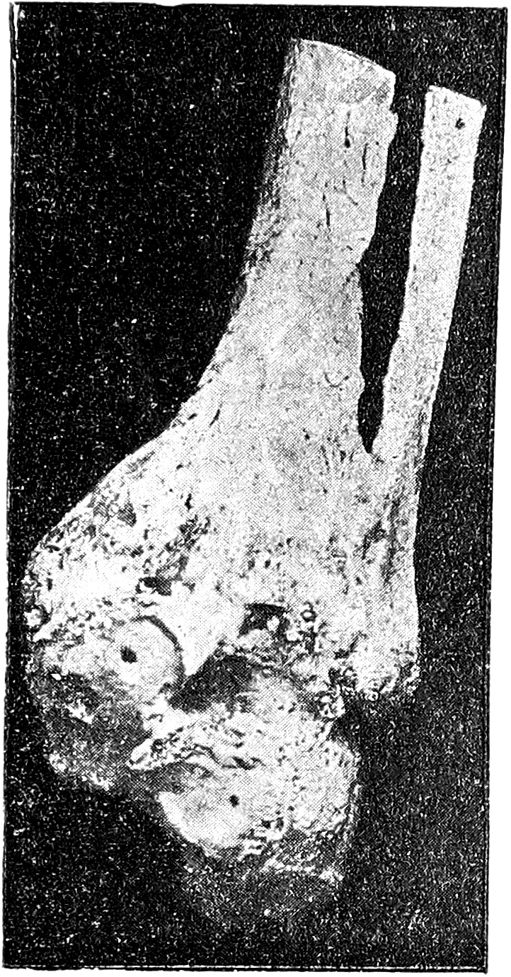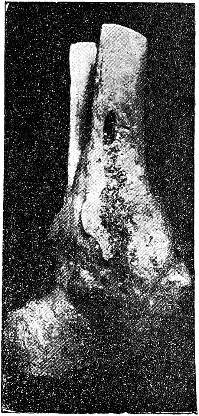 По такому способу артродезировано мною 8 человек. Первую операцию я произвел в 1922 г. на 24-летнем мужчине с болтающейся стопой после огнестрельного ранения седалищного нерва. Через 3 месяца после операции наступил прочный костный анкилоз; больной не только свободно и безболезненно ходил, но даже мог ездить верхом на лошади. Спустя 2 года после артродеза развился трофический остеомиэлит 3-го и 4 го пальцев, находившийся в связи с основным страданием нашего пациента—огнестрельным повреждением седалищного нерва. Последующий невролиз дал преходящий эффект. Точно также оказывался непрочным результат секвестротомий, каковые пришлось повторять ежегодно вследствие рецидивов остеомиэлита, который к началу 1928 г. достигнул уже среднего тарза. Чтобы радикально избавить больного от страдания, пришлось в мае 1928 г. произвести ампутацию в нижней трети голени. Рана, хотя и вяло, но через 3 недели зажила. Рис. 3 и 4 дают представление о прочности костного анкилоза корня стопы, который мы получили у данного больного в результате артродеза. Полученный результат тем более примечателен, что он получен на ноге, трофически очень сильно подорванной. Как видно из рис. 4, пластических сил организма не хватило на то, чтобы даже спустя 6 лет после артродеза выполнить костью дефект на месте поднакостнично взятого трансплантата, а между тем голень, talus и calcaneus спаяны в единый костный массив.