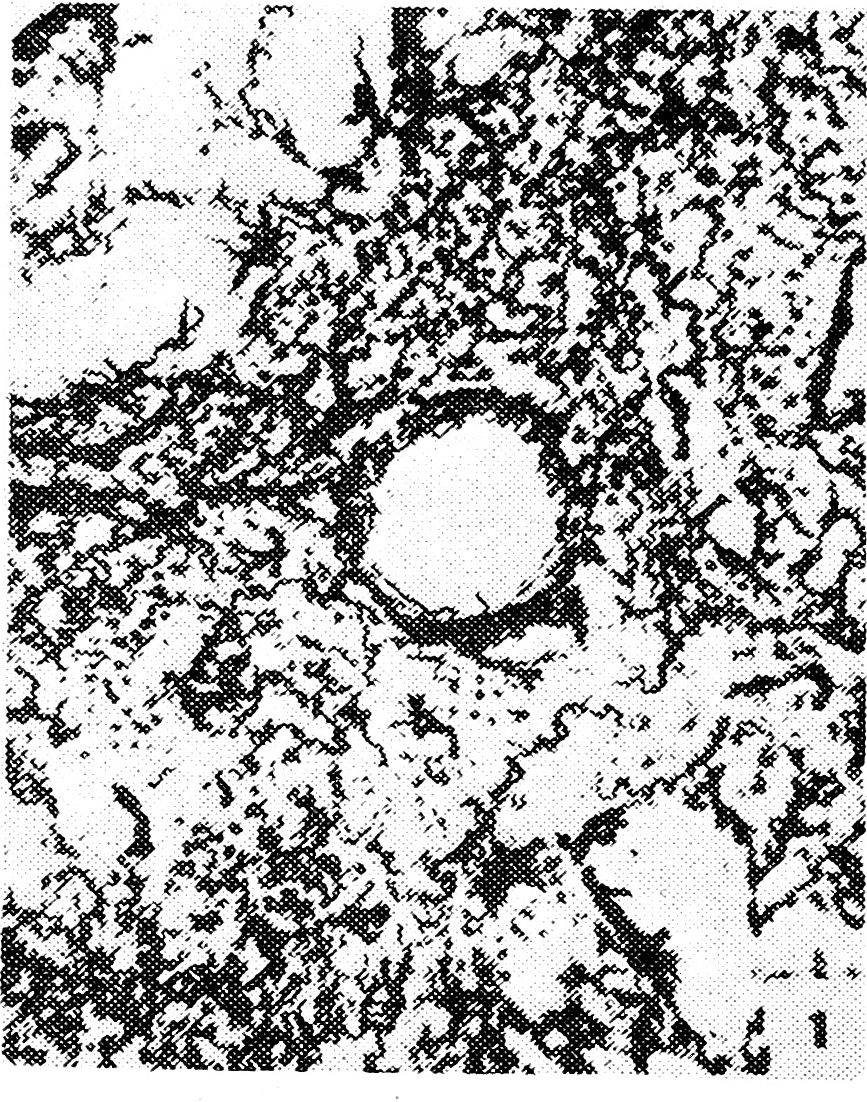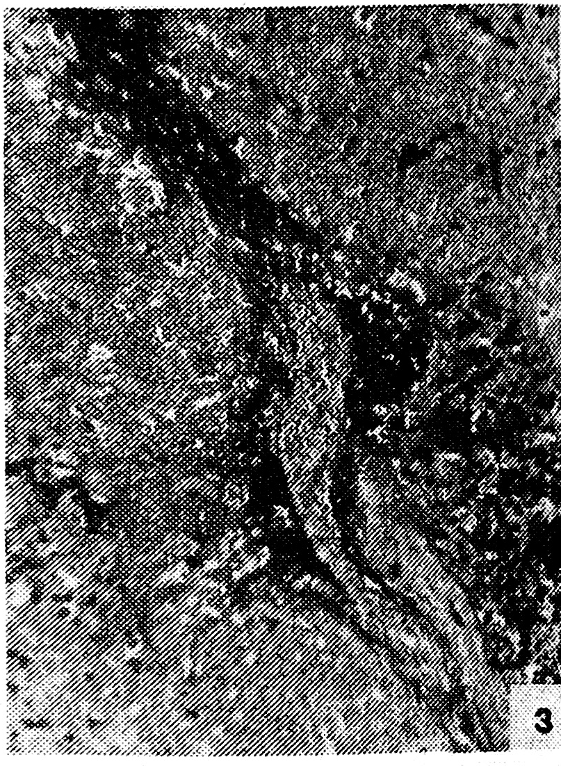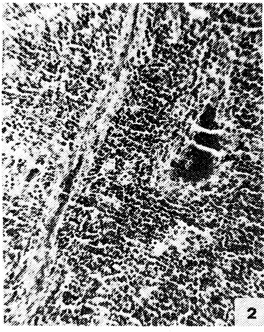 Исследования показали, что на ранних этапах развития рака еще до возникновения метастазов в лимфатических узлах имеются типичные для опухолевого роста иммуноморфологические изменения: синусный гистиоцитоз, увеличение лимфоидных фолликулов с появлением реактивных центров, выраженная плазматизация кортикальной зоны и мякотных тяжей, гиперплазия паракортикальной зоны. Отмечается изменение кровеносного микроциркулярного русла узла. Ссосудистая стенка отечна, содержит большое количество гликозаминогликанов; составляющие ее ретикулиновые волокна утолщены и огрублены (рис. 1). Местами наблюдается плазматическое пропитывание, но ферментативная активность щелочной фосфатазы и АТФ-азы в сосудистой стенке достаточно высокая. Сами сосуды резко полнокровны, просвет их расширен. Площадь сосудов составляет 5,76 ± 0,28% от общей площади среза узла. Иногда имеет место выход форменных элементов крови за пределы сосудистого русла; эритроциты диффузно разбросаны по корковому и мозговому веществу лимфоузла. В просвете некоторых сосудов обнаруживается фибрин (рис. 2); площадь этих сосудов равна 1,5 ± 0,04% от площади лимфатического узла. Кое-где фибрин располагается за пределами сосудов, но площадь его мала (0,74 ± 0,08%).