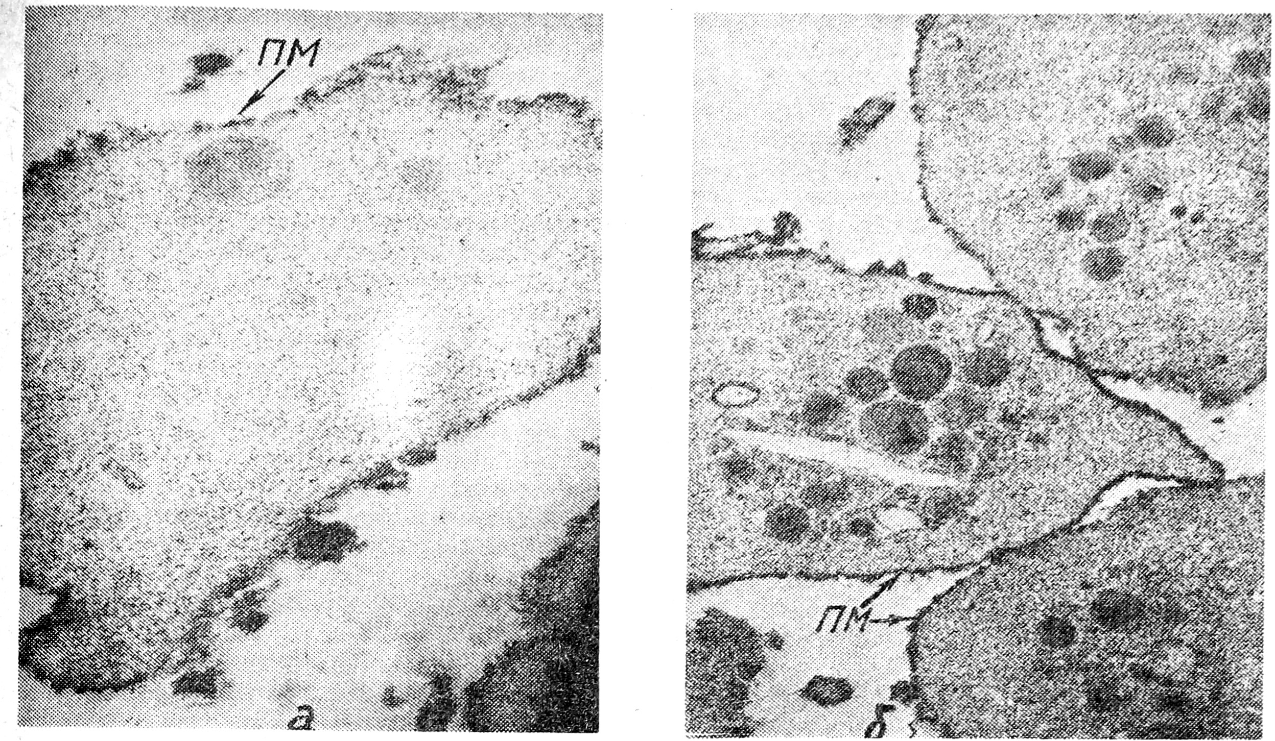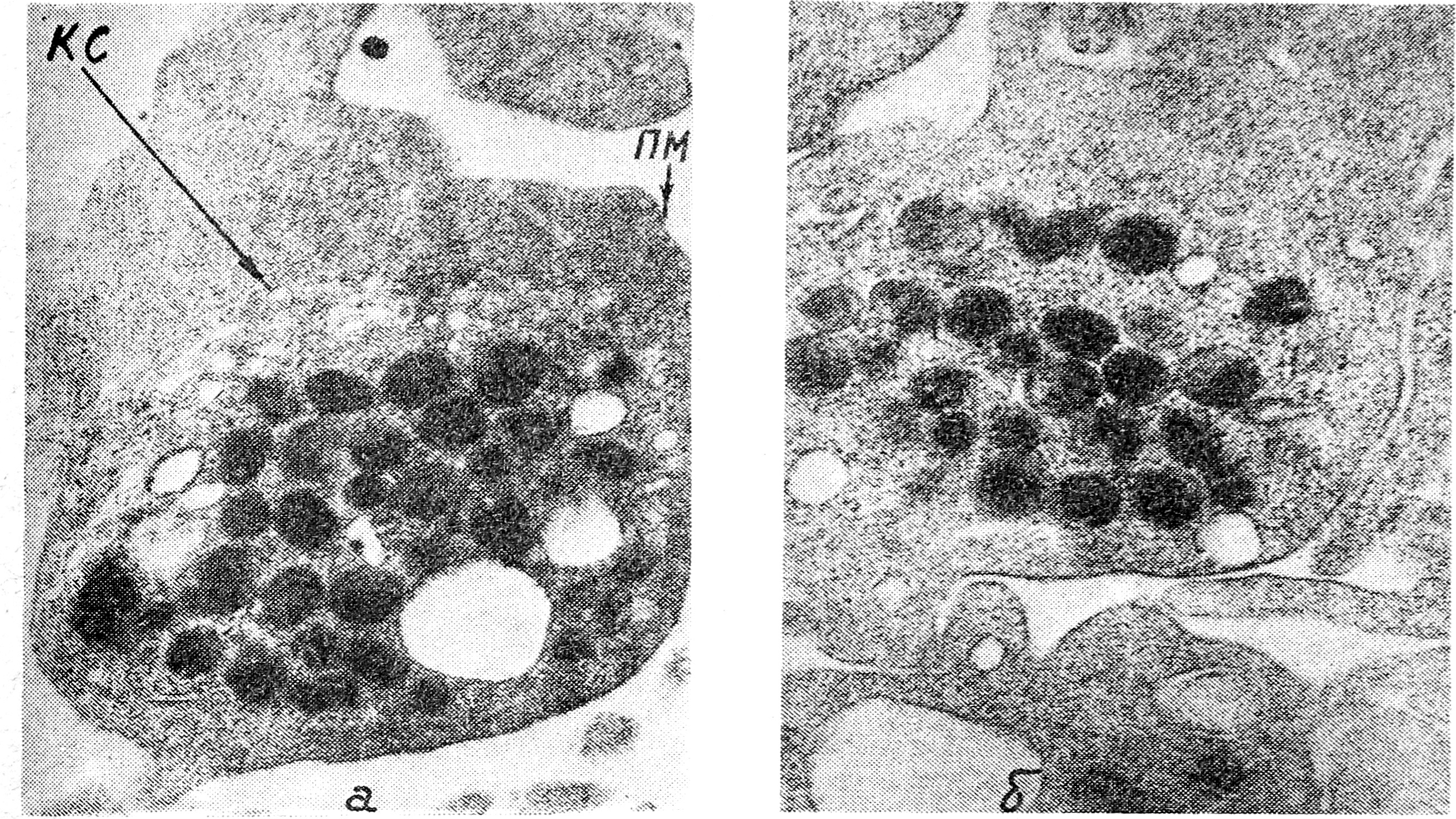 Рис. 1. Ультраструктура тромбоцитов при болезни Бернара —Сулье. а—большое количество гранул, развитая канальцевая система (КС), митохондрии; тонкая поверхностная мембрана (ПМ). Х 12.000; б — митохондрии, гранулы различной электронной плотности. X 12.000.