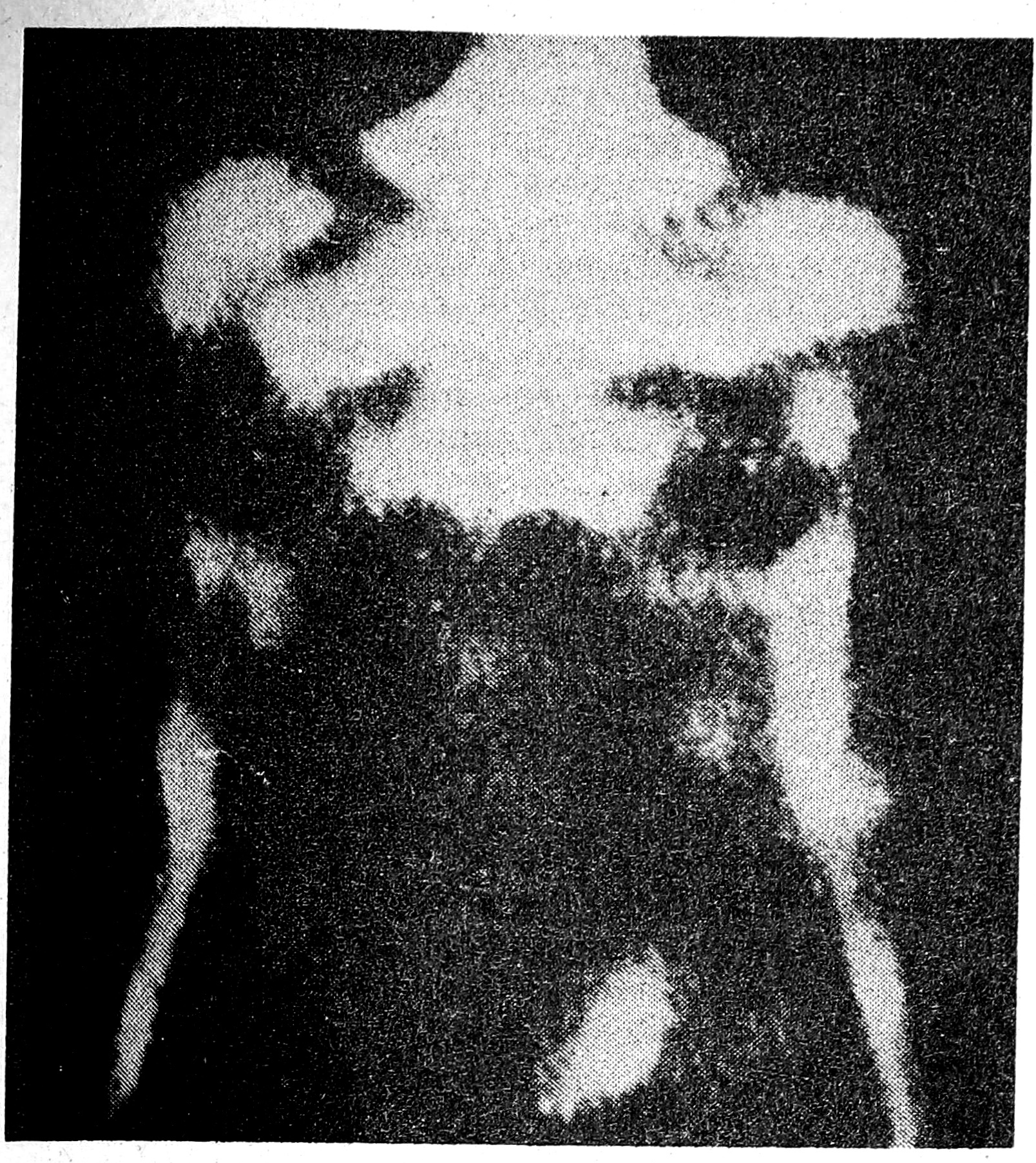 У 18 (8,5%) больных тепловизионное исследование дало неопределенные результаты. Клинически у 16 из них заболевание протекало в легкой форме и у 2 — в среднетяжелой. При ректороманоскопии определялся катаральный проктосигмоидит. У остальных 179 (84,4%) больных результаты тепловизионного исследования оказались положительными (в группе больных со среднетяжелым течением этот процент составил 98,5, с легким — 61,6). По характеру термографической картины больные были разделены на три группы. У 84 (46,9%) пациентов 1-й группы на термограммах органов брюшной полости определялось множественное очаговое свечение по ходу толстой кишки, более выраженное в области слепой кишки и ректосигмовидного угла (рис. 2).