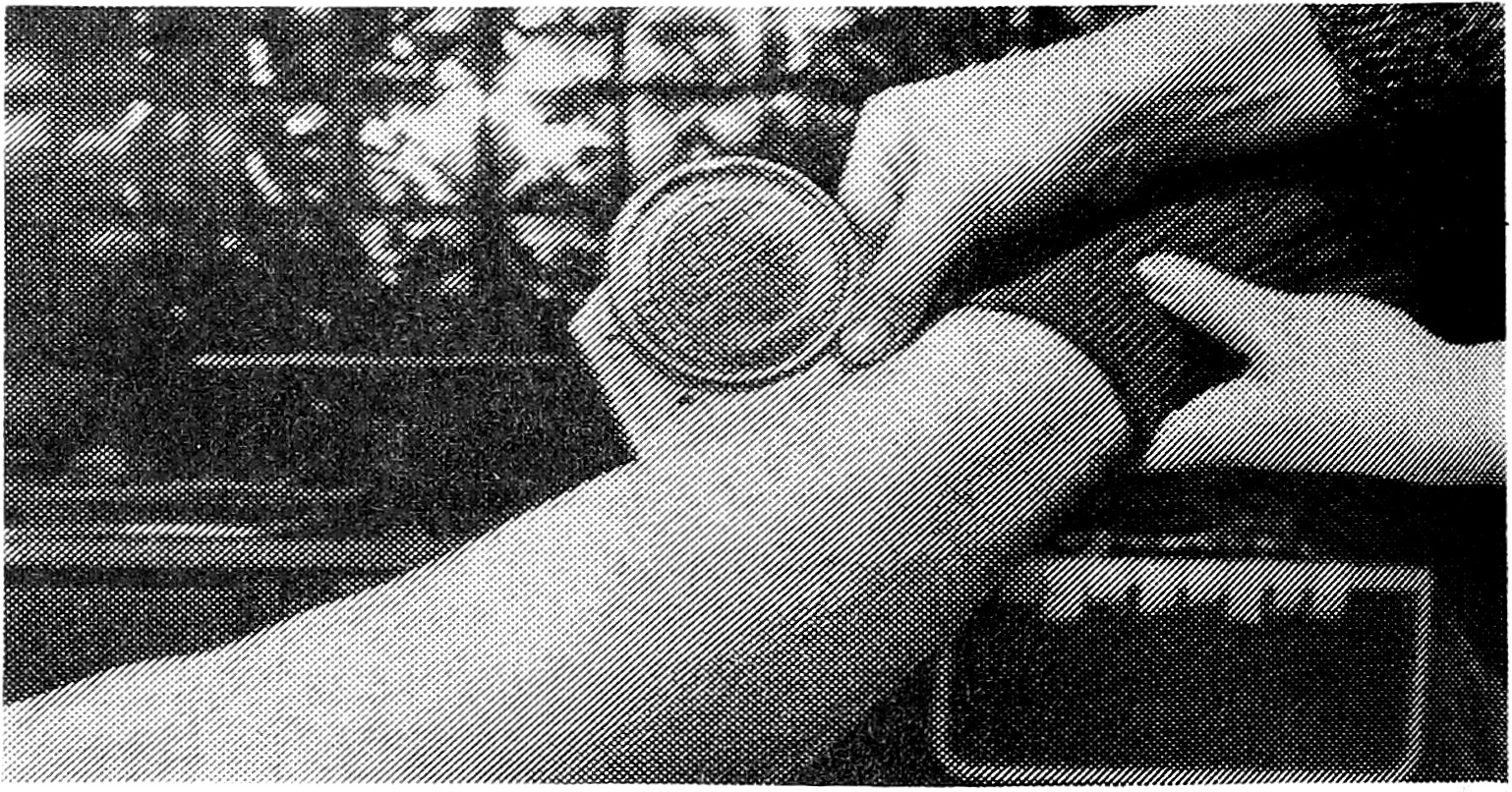 Измерения заключаются в следующем. Угломер ставят на подвижный сегмент конечности и в таком положении снимают показания прибора (рис. 2). После выполнения больным соответствующего движения опять фиксируют угол. Разница этих двух показателей и есть объем движения в данном суставе.