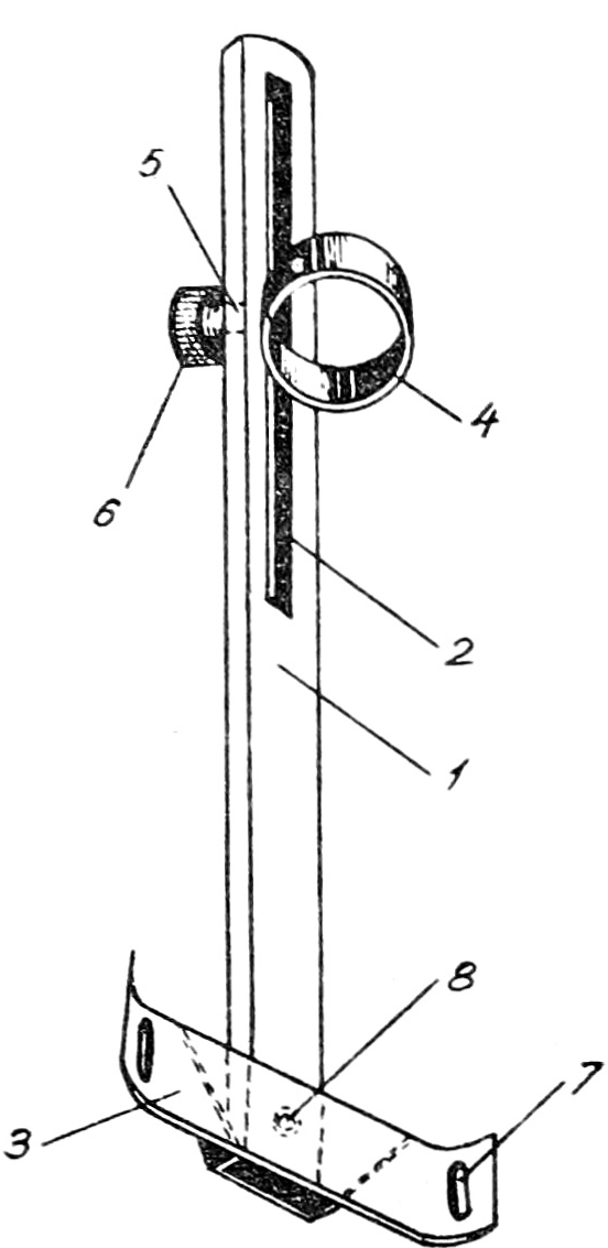 С целью дифференцированной разработки движений в межфаланговых суставах пальцев кисти с участием самого больного предлагается специальное устройство (см. рис.). Оно состоит из основания (7) с продольным пазом (2) на дистальном конце и браслетом (5) на проксимальном конце основания. В продольном пазе крепится кольцо (4) с помощью резьбового штыря (5) и винта (6). На концах браслета имеются поперечные прорези (7) для крепления. Основание соединено с браслетом шарниром (8).