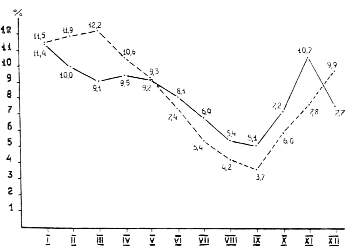 Рис. 1. Сезонность эпидемического паротита в г. Саратове в допрививочный период (1954—1981 гг.) и за 4 года после начала активной иммунизации (1982—1985 гг.). По оси абсцисс — месяцы; по оси ординат — заболеваемость в % к годовому ИТОГУ; сплошная линия — показатели заболеваемости в 1982—1985 гг.; прерывистая линия — показатели заболеваемости в 1954—1981 гг.