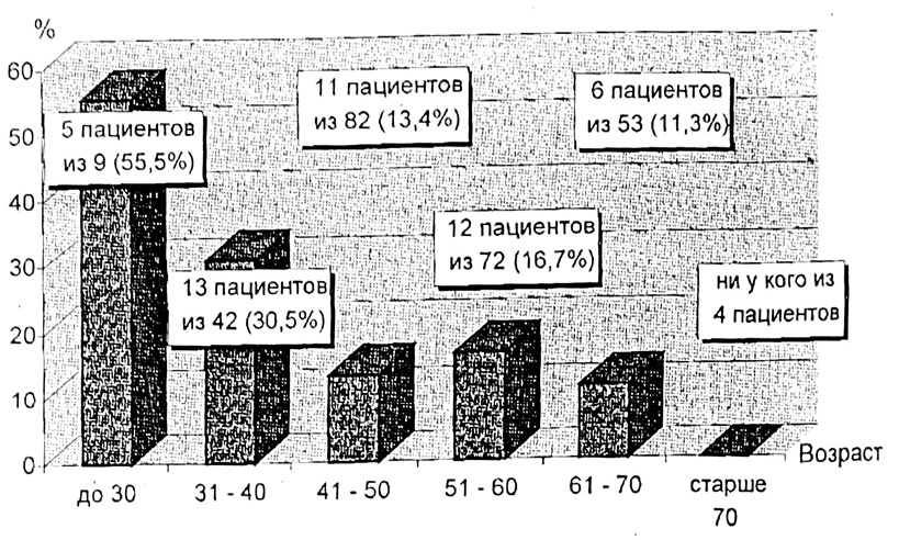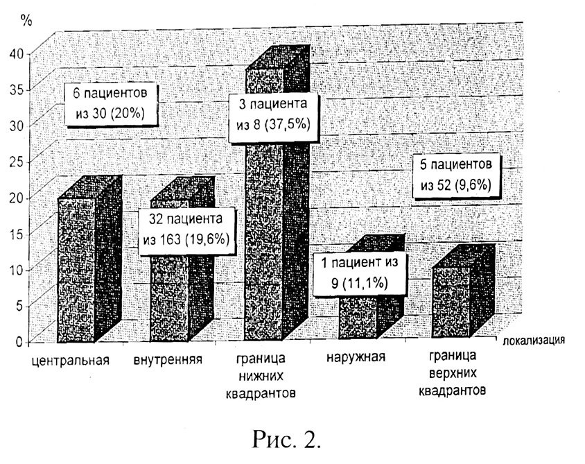 Метастазы в парастернальных ЛУ были обнаружены у 47 (17,9%) больных, у 9 (3,4%) из них — только в парастернальных ЛУ, без поражения аксиллярного лимфатического коллектора. Зависимость поражения парастернального лимфатического коллектора от возраста, локализации первичной опухоли, показана на рис. 1—2.