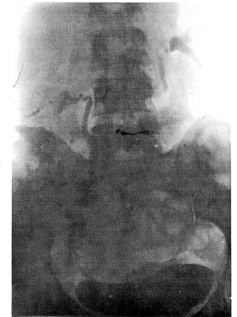Рис. 2. Внутривенная экскреторная урография больной Н., 34 лет, в клиностазе: двусторонний нефроптоз, гидронефротическая трансформация, коленообразные перегибы мочеточников. Нефроптоз III степени в ортостазе