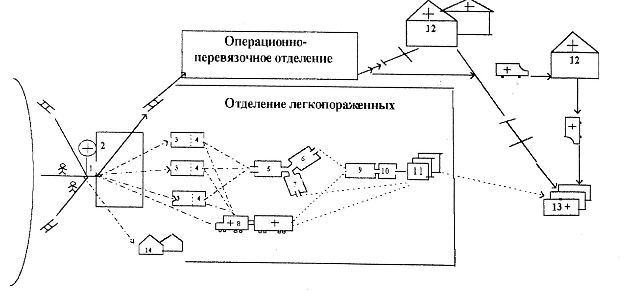 Рис. 1. 1. Сортировочный пост. 2. Сортировочная площадка. 3. Приемно-диагностическая палатка. 4. Палатка (отделение от палатки) иммунопрофилактики. 5. Предоперационная. 6. Операционная. 7. Перевязочная для обоженных. 8. Лечебно-диагностический комплекс “Медицина катастроф”. 9. Гип совальная. 10. Сушилка. 11. Эвакуационная. 12. Лечебно-профилактическое учреждение. 13. Поликлиника. 14. Психоизолятор.