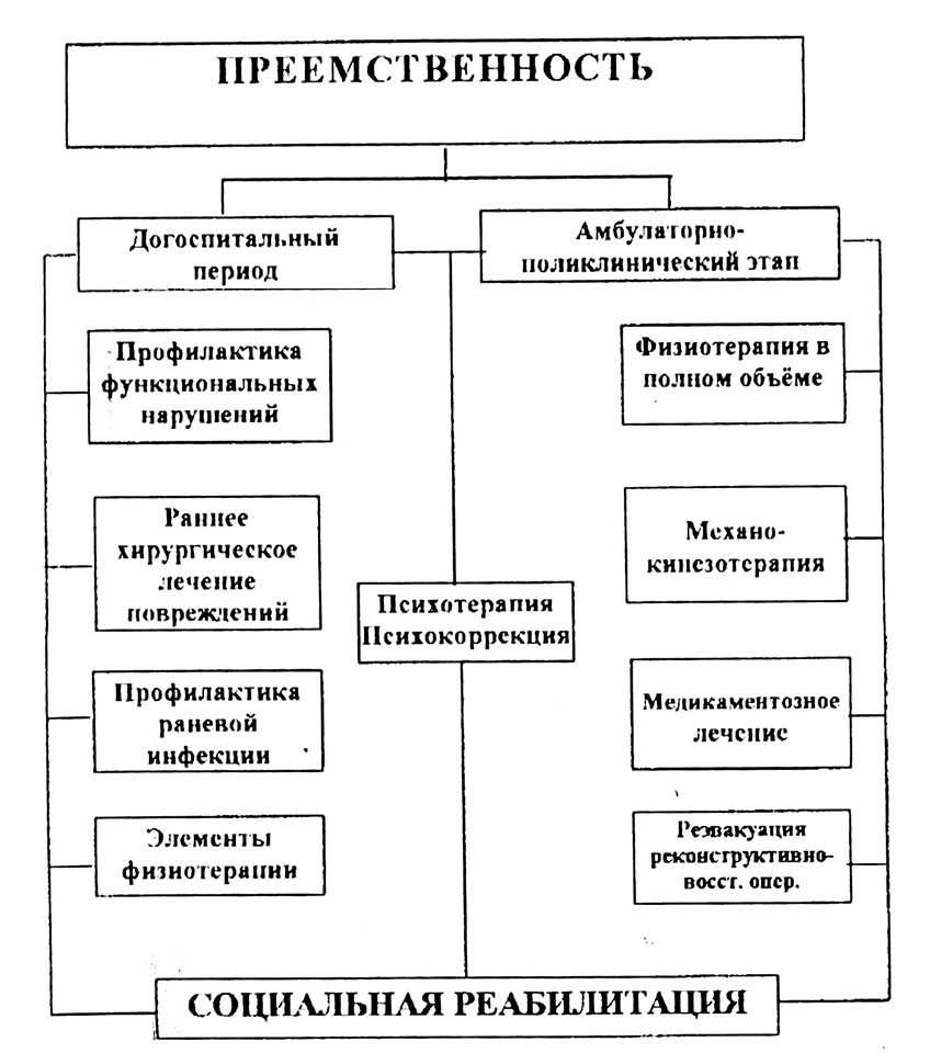 В интегрированной системе специализированной хирургической помощи амбулаторно-поликлиническая служба является организационной основой реабилитации ЛХП. Непременными условиями достижения желаемых результатов реабилитации служат своевременность, последовательность, преемственность, комплексность в сочетании с индивидуальным подходом к пораженному. В поликлинике как в центре реабилитации должны решаться следующие основные задачи — проведение этапной и заключительной реабилитации, осуществление мероприятий по восстановлению трудоспособности, коррекция психоэмоционального состояния пораженного, вторичная профилактика и предупреждение обострений раневого процесса, врачебная экспертиза и решение социальных вопросов (рис. 2). Описанный комплекс организационных и лечебно-эвакуационных мероприятий позволяет представить в виде единого процесса оказание медицинской специализированной помощи, лечение и реабилитацию ЛХП.