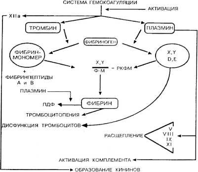 Тромбинемии сопутствует системная плазминемия, причем если тромбин ответственен за тромботический компонент ДВС, то плазмин обусловливает геморрагические проявления путем образования ПДФ, их взаимодействия с фибрин-мономером и угнетающего действия на функцию тромбоцитов. Кроме того, плазмин расщепляет многие факторы свертывания крови, что усугубляет кровоточивость.