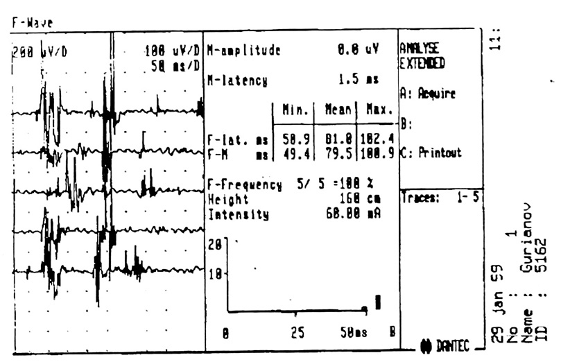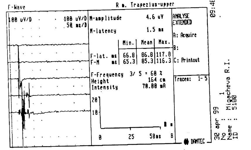 - Нестабильность латентности (35 — 300 мс): чем дальше расположена мышца от стимулируемого нерва, тем больше латентное время. В пределах одного миотома сгибатели отвечают раньше разгибателей.