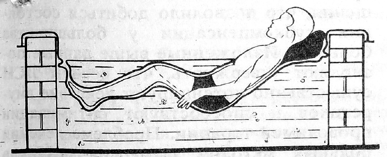 ЛСИ проводят в специально изготовленной ванне емкостью до 1 м3, которую заполняют обычной водой (34— 36°) и поддерживают температуру среды при помощи автоматической системы подогрева. Больной погружается в водную среду на эластичной водонепроницаемой ткани (см. рис.). В отличие от классического способа «сухой» иммерсии изголовье больного приподнято. Продолжительность сеанса зависит от тяжести состояния больного, переносимости условий ЛСИ и колеблется от 2 до 6 ч. При необходимости сеансы можно повторять через 5—7 дней (курс — 1—3 сеанса).