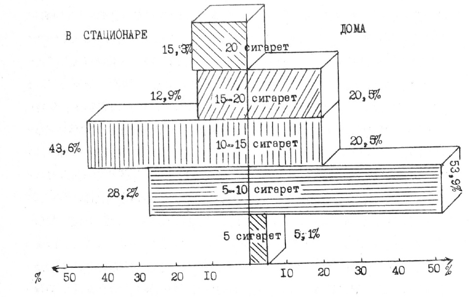 Как показали исследования, 91,7% больных шизофренией оказались курящими, что значительно превышало число курящих здоровых мужчин в популяции. По данным Э. В. Малая [1], в СССР насчитывается от 70 до 75% курящих мужчин. Среди больных эпилепсией (контрольная группа) курили 68% мужчин.