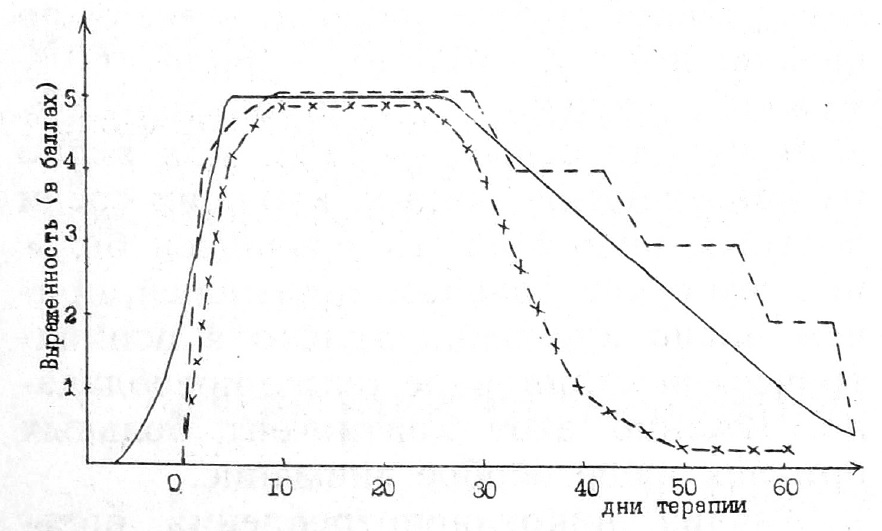 Рис. 2. Зависимость интенсивности курения от доз нейролептиков и выраженности нейролептического синдрома. Обозначения: сплошная линия — курение, пунктирная — дозы нейролептиков, фигурно-пунктирная — нейролептический синдром.