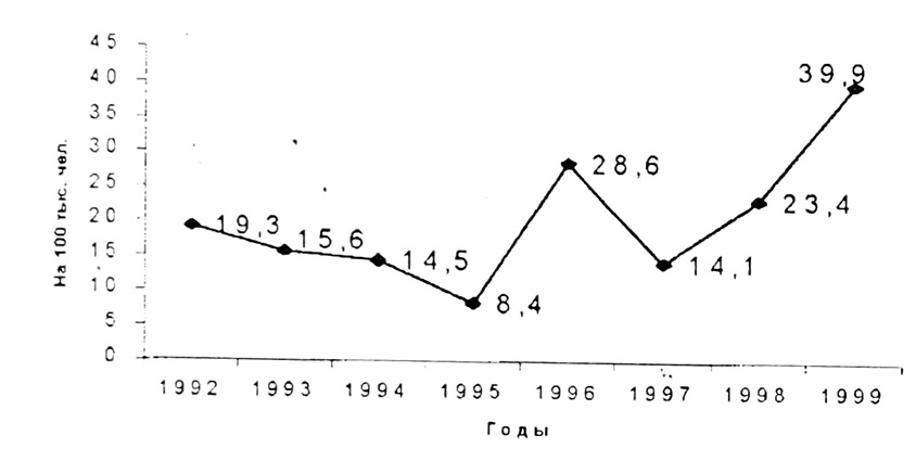 В гемограмме у большинства больных (63,9%) выявлен нормоцитоз. Довольно часто регистрируемая у них лейкопения (у одной трети) является, вероятно, отражением развития вторичного иммунодефицита. Лейкоцитоз имел место лишь у 3 (3,6%). В лейкоформуле относительный нейтрофиллез наблюдался у 38 (45,8%) человек, причем у 2 из них на фоне лейкоцитоза. Относительный лимфоцитоз имел место у 19 (22,9%) больных, а относительный моноцитоз — у 26 (31,3%). Увеличение СОЭ отмечено у 35 (42,2%) человек. В моче у 13 (15,7%) пациентов на фоне повышения температуры выявлена кратковременная протеинурия. В целом изменения отдельных показателей анализов крови и мочи носили неспецифический характер.