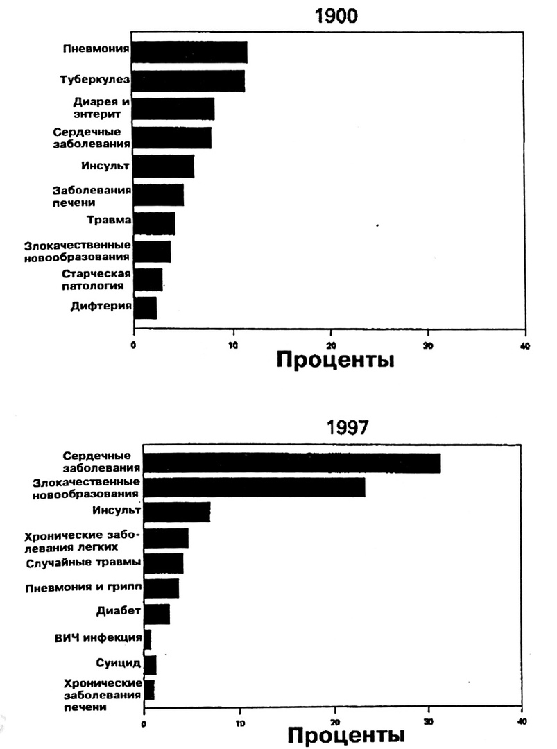Рис. 1.10 ведущих причин смерти в начале и в конце XX века (%) в США.