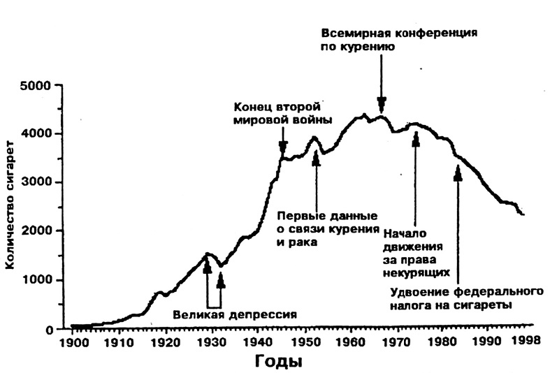 Кривая потребления табака в США на протяжении XX века представлена на рис. 2. Объем годового потребления сигарет на душу населения вырос с 54 в 1900 г. до 4345 в 1963 г., а затем снизился до 2261 в 1998 г. Такая динамика имеет объяснение. Росту числа курильщиков в начале века способствовали распространение нового способа ингаляции табачного дыма (заворачивание табака в бумагу), изобретение безопасных спичек, развертывание массового производства табачных изделий в сочетании с возможностью их транспортировки на большие расстояния, а также их реклама. Параллельно распространению табакокурения сначала среди мужчин, а потом и среди женщин неуклонно возрастали заболеваемость и смертность от рака легкого и сердечно-сосудистых заболеваний. Так, рак легкого, являясь сравнительно редким заболеванием в начале века, в 1930 г. обусловил 4,9 смертельных случаев на 10 тысяч населения, однако к 1990 г. этот показатель составил уже 75,6 на 10 тысяч населения.