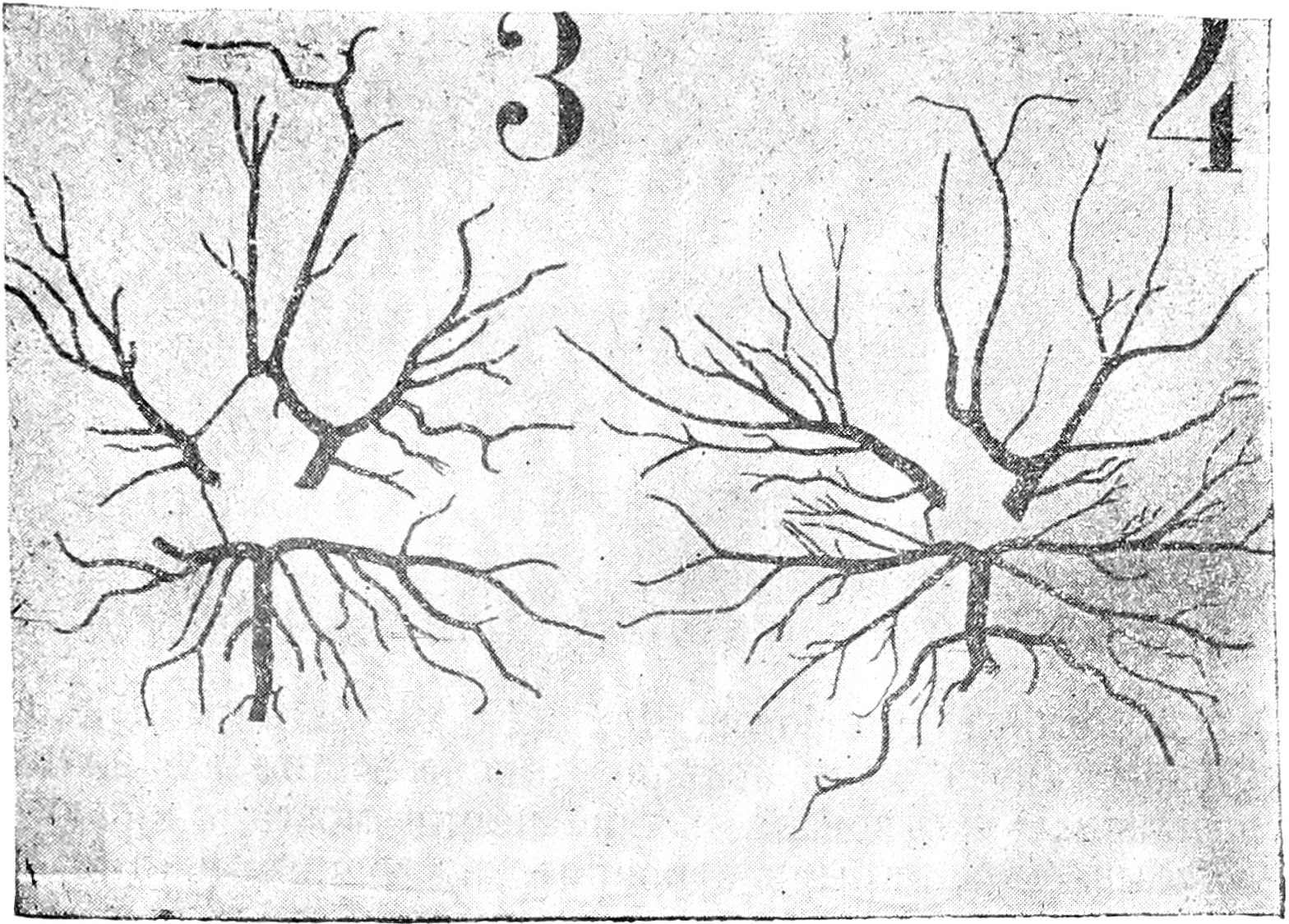 При сравнении артериальной системы обоих мозгов бросилось в глаза сходство формы Willisi’eвa круга, а вместе с тем и сходство формирования артерий головного мозга. Эти результаты сравнения навели меня на мысль произвести исследование сосудов головного мозга близнецов и двойных уродцев, хранящихся в нашем музее. К сожалению, у двух дицефаликов и у двух близнецов, по вскрытии черепа, оказалось, что головной мозг, вместе с сосудами и оболочками, представлял из себя кашицеобразную массу, и лишь у одного торакопага, хранившегося с 1845 года, удалось, хотя и с большим трудом, частично выделить сосуды. При сравнении полученных препаратов результаты получились те же, что и у первой пары,—сходство Wil lis Рева круга имелось налицо.