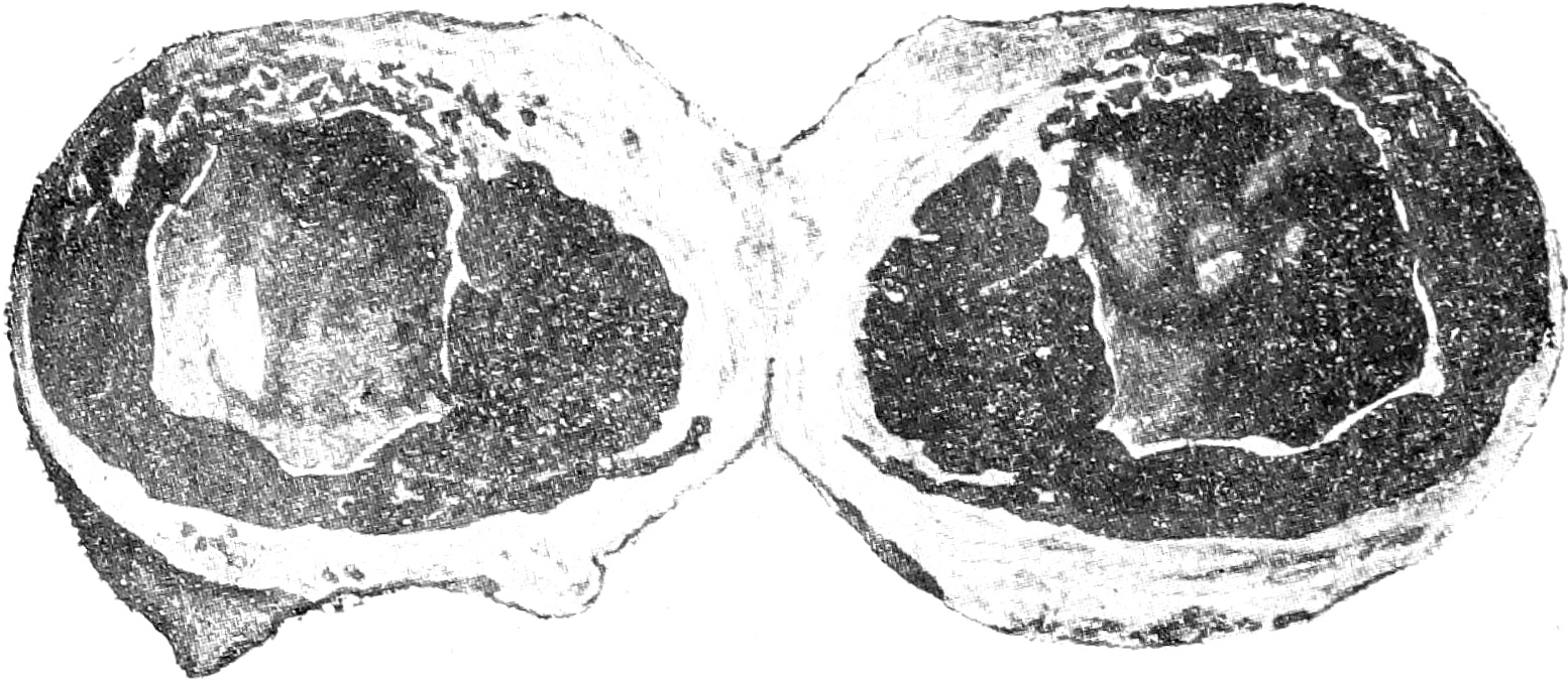 Макроскопическое описание препарата: удаленное образование—овальной формы, длиною в 6 1/2 стм., шириною 4 стм., толщиною 3 1/2; на латеральном, суженном конце его видна часть трубы, отходящая от него снизу, а на передненаружной поверхности—отрезанная часть, круглой связки; на противоположном (медиальном) конце, имеющем клинообразную» форму, виден мощный слой мускулатуры с отверстием в центре: при продольном разрезе препарата в центре его оказывается полость, выстланная amnion’ом и окруженная по периферии сгустками крови и губчатой тканью; наружных разрывов не видно.