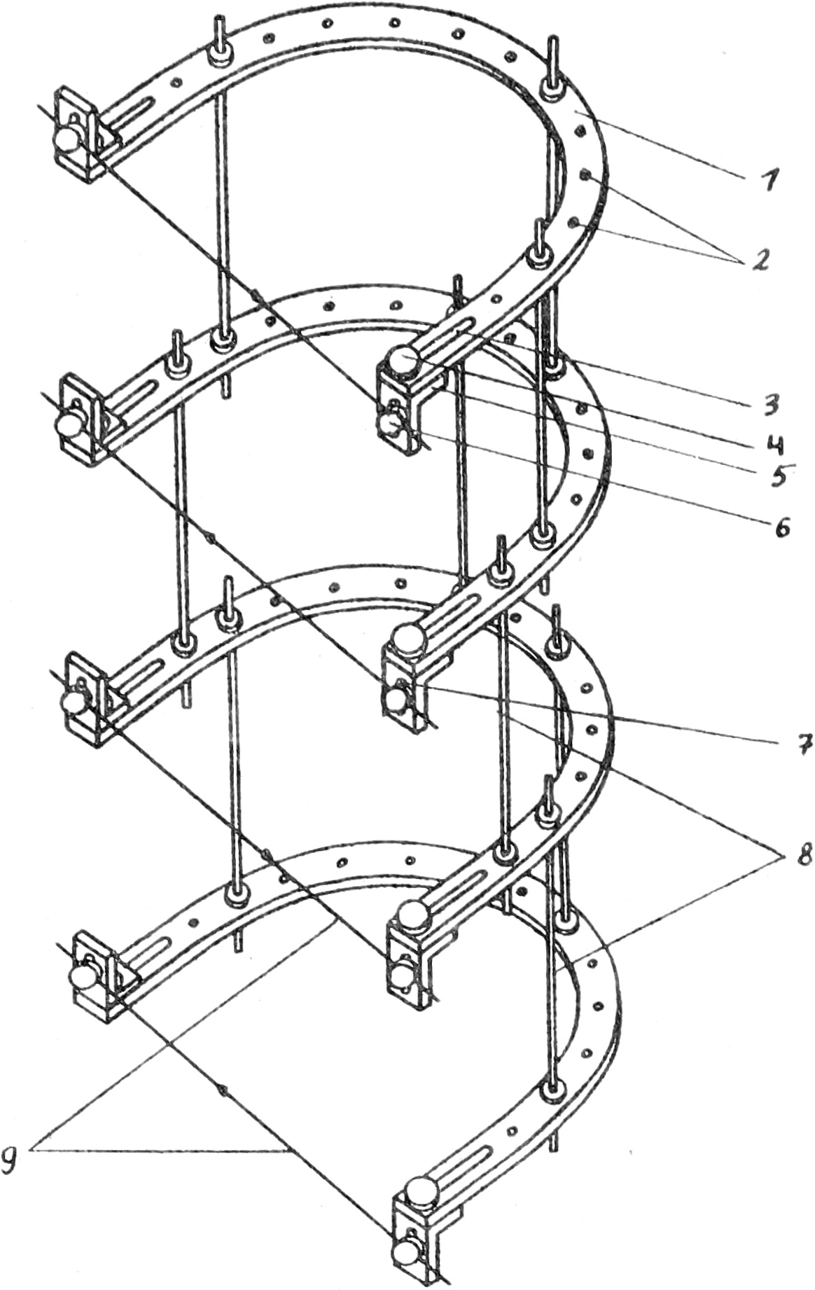 Устройство для остеосинтеза длинных трубчатых костей (рис. 1) содержит дуги (1), представляющие собой полукольца с удлиненными прямолинейными концевыми частями. В дугах имеются отверстия (2), а в концевых частях дуг расположены пазы (3). В последних посредством болтов с гайками (4) крепятся лапки (5), представляющие собой уголки, на одной стороне которых выполнены пазы (7) под спицедержатели (6). В спицедержателях фиксируются спицы с упорами (9). Лапки ориентированы на дугах в разные стороны. Дуги друг с другом и пары дуг между собой крепятся резьбовыми штангами (8), проведенными через отверстия.