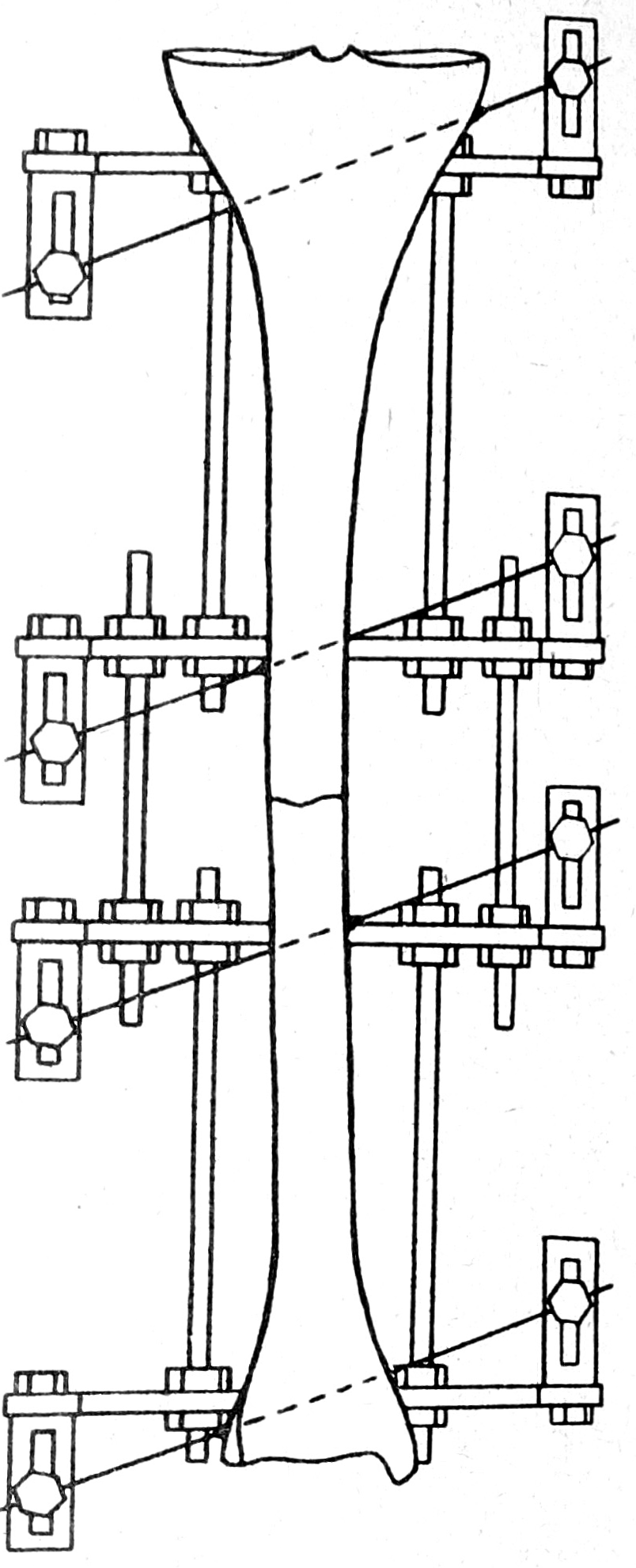Через один из костных фрагментов проводим спицу с упором под углом к оси кости. На расстоянии, превышающем длину лапки устройства не менее чем на 2 см, через этот же фрагмент пропускаем вторую спицу с упором параллельно первой и располагаем ее упор на противоположной поверхности кортикального слоя. Аналогичным способом проводим спицы и через второй костный фрагмент. Для большей стабильности фиксации спицы, проходящие через один костный фрагмент, размещаем на максимально возможном удалении друг от друга, но не ближе 1—2 см к краю кости. Угол между осью спицы и костного фрагмента для бедренной кости взрослого составляет 15±3°, для большеберцовой и плечевой костей — 20±3°, для костей предплечья — 25±3°.