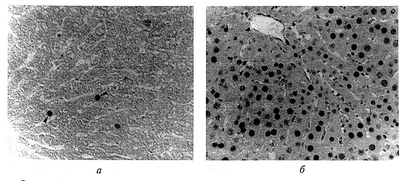 Рис. 1. Срезы печени крысы, окрашенные антителами к PCNA.а — печень контрольной крысы — единичный пролиферирующий гепатоцит (стрелка);б — через 48 часов после введения нитрата свинца — пролиферирующие ядра большинства гепатоцитов; х 200.