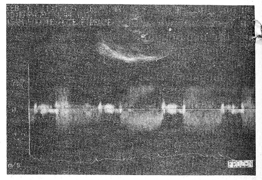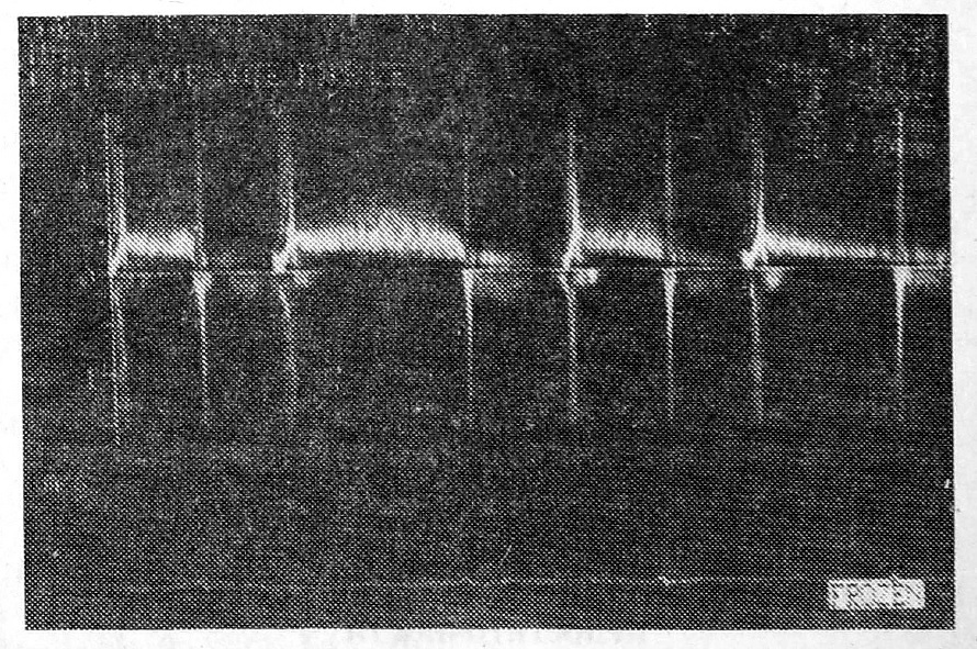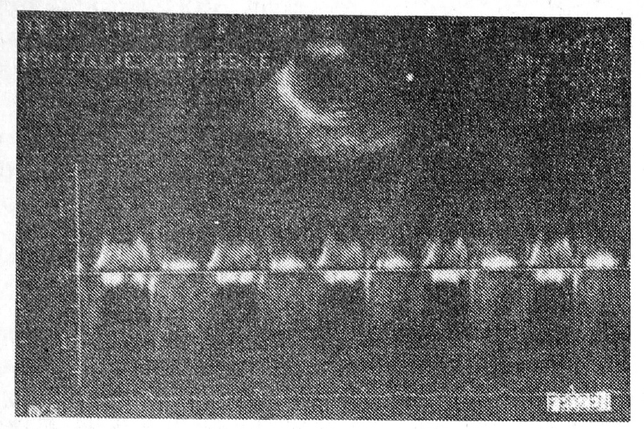 На рис. 1 приведена допплерэхокардиограмма при выраженном митральном стенозе. Митральный поток в диастолу (см. синхронизацию с ЭКГ внизу рисунка) патологически изменен — вместо двухпиковой имеется куполообразная форма, характер потока турбулентный — множество сигналов внутри контура в связи с хаотическим движением частиц крови в определенном участке кровотока. На рисунке видны также щелчки открытия и закрытия митрального клапана — вертикальные осцилляции до и после диастолического потока (продолжительность фаз систолы и диастолы допплерэхокардиограммы в данном случае в разных циклах сердечной деятельности неодинакова в связи с фибрилляцией предсердий).