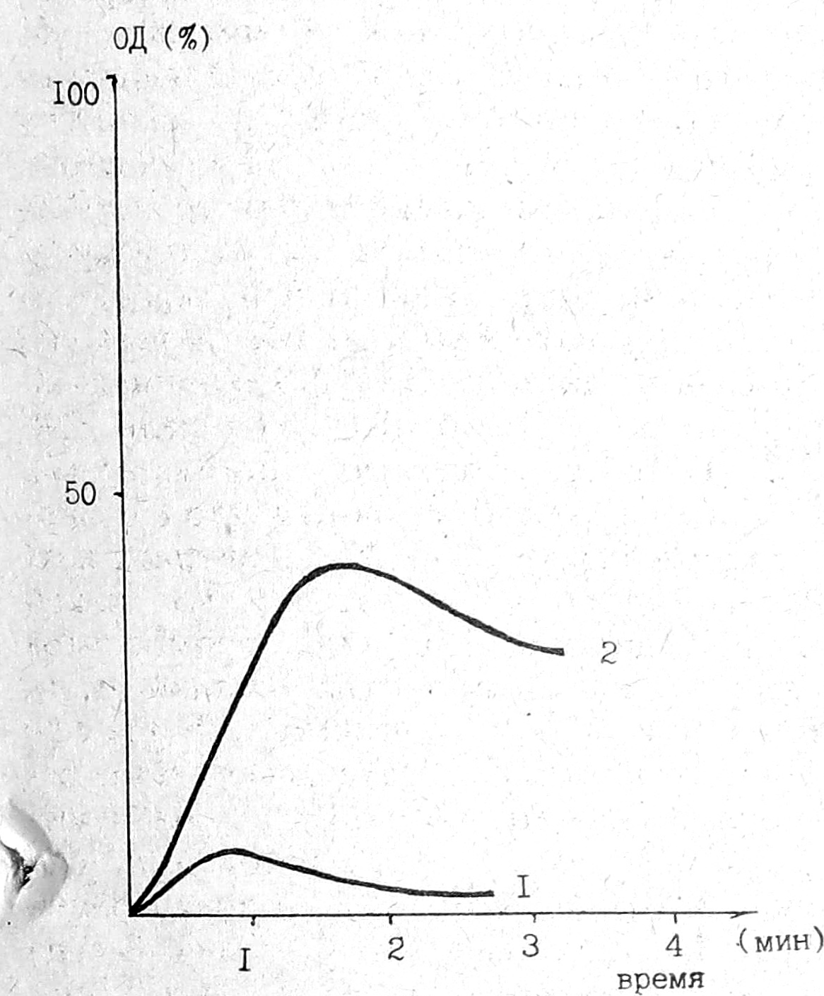Рис. 1. Запись АДФ-индуцированной агрегации тромбоцитов в богатой тромбоцитами плазме, стабилизированной пиявитом (1) и гепарином (2).