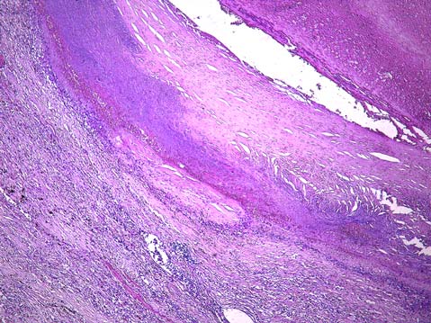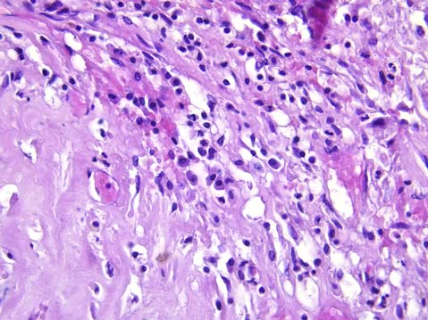 5. Рис. 4. Сифилитический мезаортит. Гуммозный инфильтрат в средней оболочке аорты: клеточный состав инфильтрата представлен плазмоцитами, макрофагами, лимфоцитами. Окраска гематоксилином и эозином. Увеличение ×400