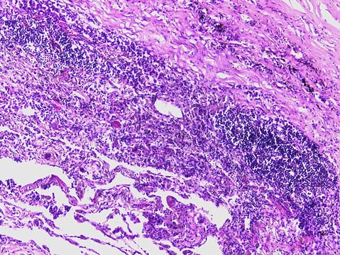 3. Рис. 2. Гумма в лёгком: вокруг очага казеозного некроза воспалительный инфильтрат из лимфоцитов, макрофагов, плазмоцитов, эндоартериит. Окраска гематоксилином и эозином. Увеличение ×200