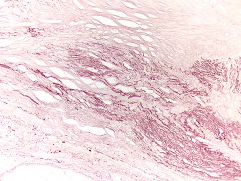 При гистологическом исследовании обнаружена в средней оболочке аорты диффузная и очаговая воспалительная инфильтрация преимущественно из плазмоцитов, макрофагов, лимфоцитов, склероз (~~~~~~~~~рис. 3); при окраске резорцин-фуксином — очаги разрушенных эластических волокон (рис. 4).