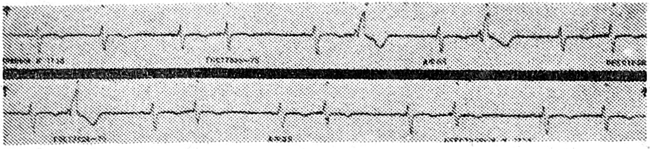 За больной В. наблюдали в поликлинике и неоднократно консультировали на кафедре функциональной диагностики Казанского ГИДУВа с проведением ЭКГ-исследований. В анамнезе — перенесенный миокардит. Физическое развитие удовлетворительное; при аускультации определялась нерегулярность ритма, не связанная с дыханием. Больная получала антиаритмическую терапию: новокаинамид, препараты калия, витамины. Проведенное лечение не дало положительного эффекта. В настоящее время актуален вопрос об индивидуальном подборе антиаритмических препаратов. Как видно, ведение и лечение таких больных вызывает серьезные затруднения.