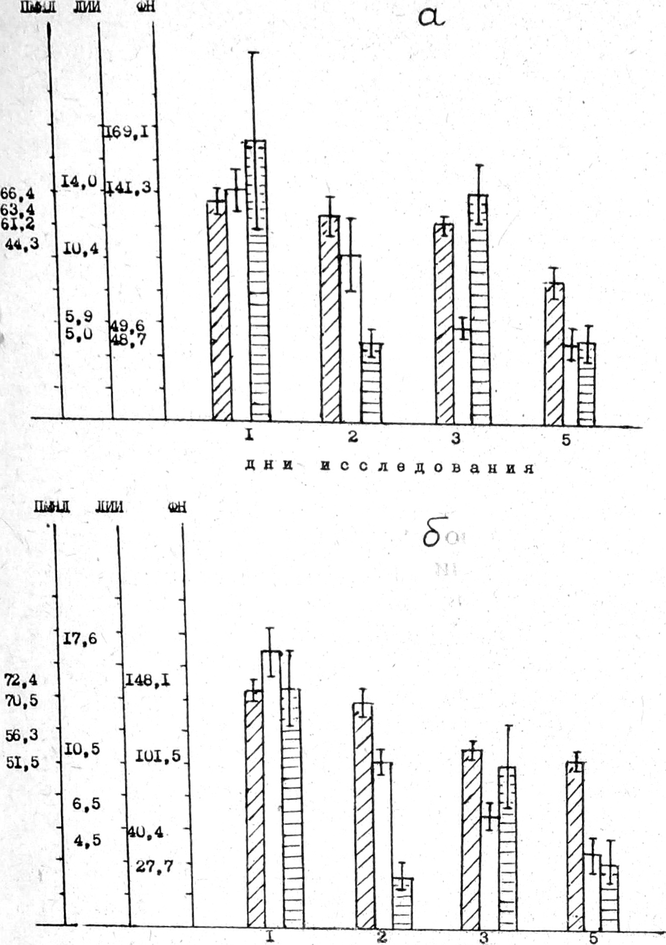 Рис. 1. Изменение содержания фибронектина, полиморфноядерные лейкоциты и ЛИИ перитонеального экссудата при местном (а) и разлитом перитоните (б) с благополучным исходом.