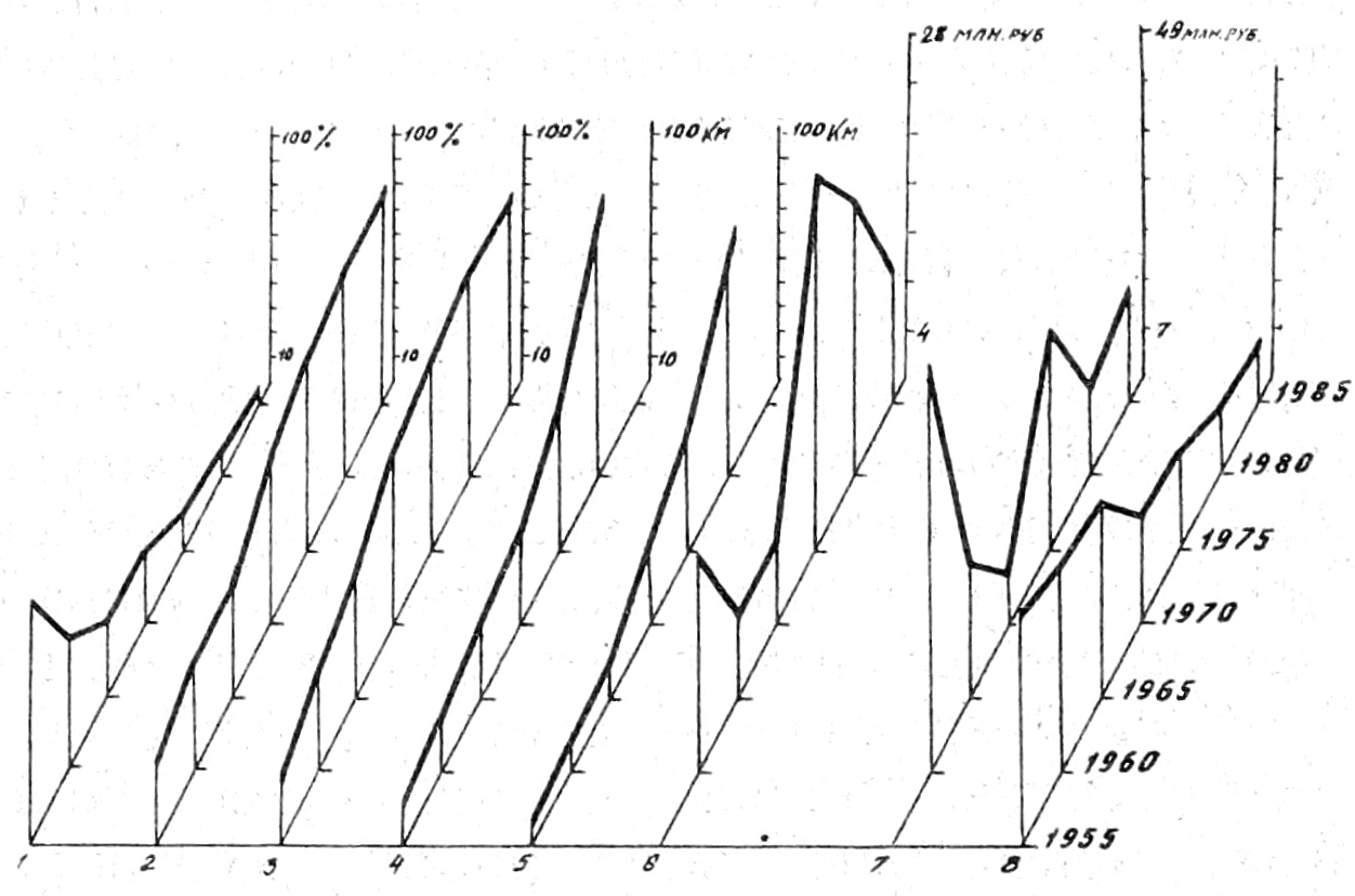 ис. 1. Динамика заболеваемости и показателей санитарного благоустройства: 1 — заболеваемость брюшным тифом в % от 1955 г. (100%, 2 — обеспеченность жилого фонда водопроводом, 3 — обеспеченность жилого фонда канализацией, 4 — протяженность водопроводных сетей, 5 — протяженность канализационных сетей, 6 — капитальные вложения на строительство систем и сооружений водопровода, 7 — капитальные вложения на строительство систем и сооружений канализации, 8 — снижение числа шахтных колодцев (в тыс.).